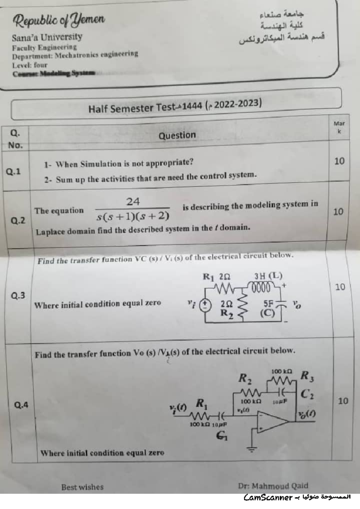 Modeling Systems Midterm Exam - Mechatronics Eng. 241218 - Studocu