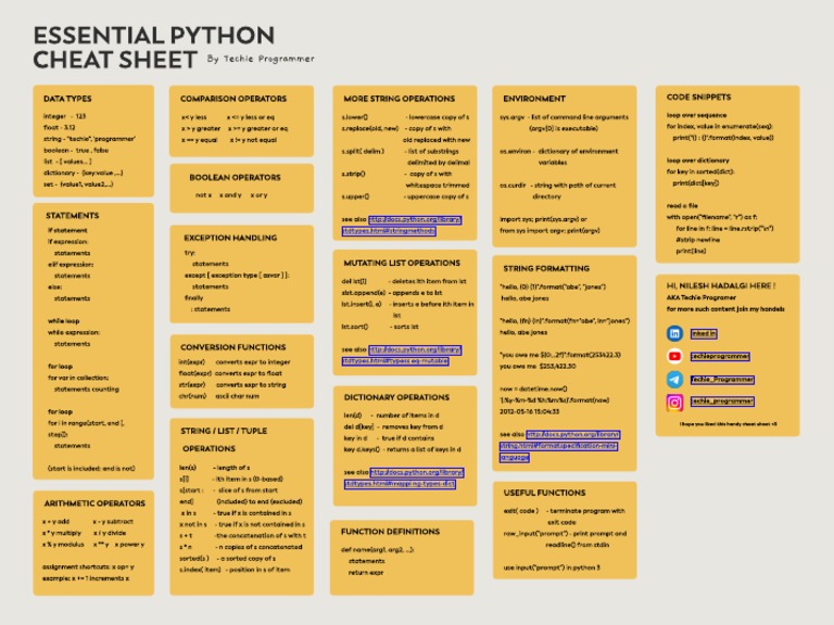 Essential Python Cheat Sheet by Techie Programmer | PDF | Boolean Data ...