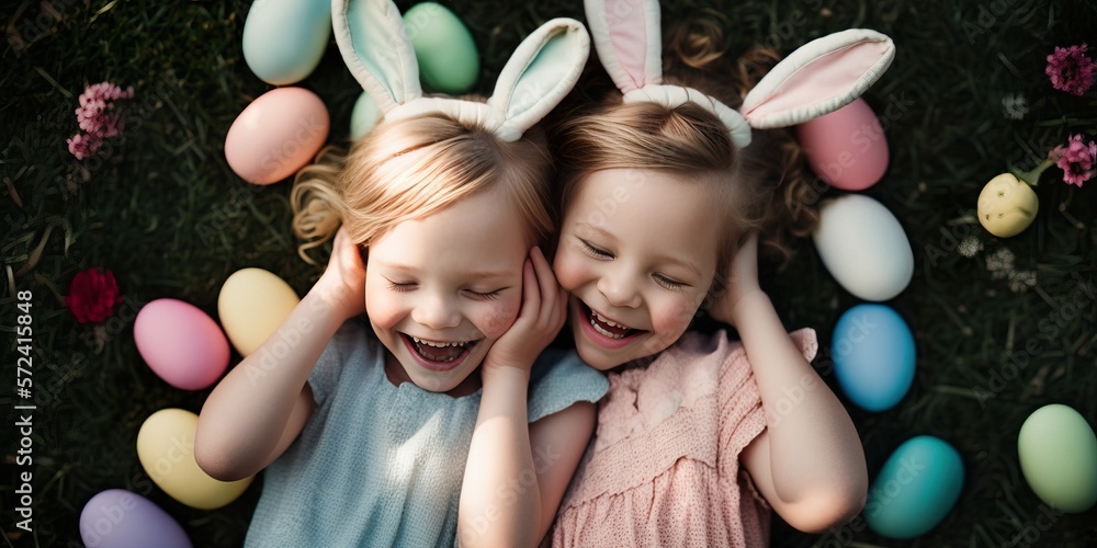 Flat lay of joyful smiling little kids enjoying Easter holidays ...