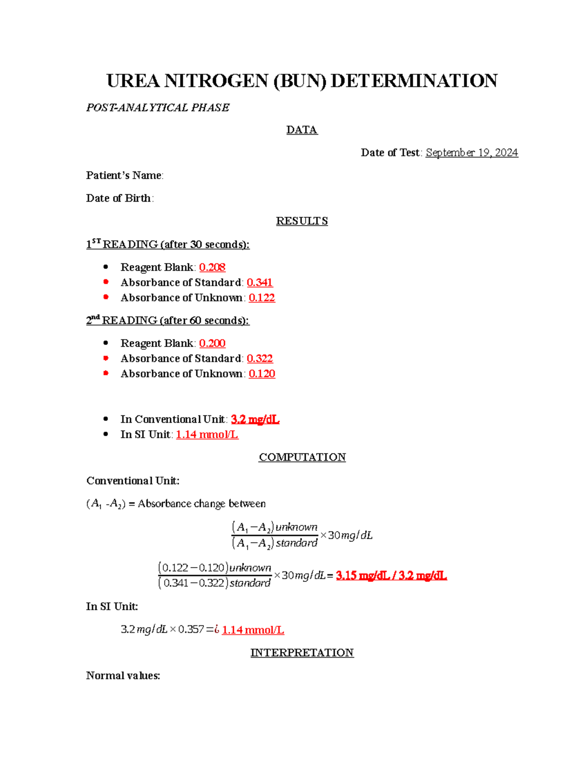 BUN - assignments - UREA NITROGEN (BUN) DETERMINATION POST-ANALYTICAL ...