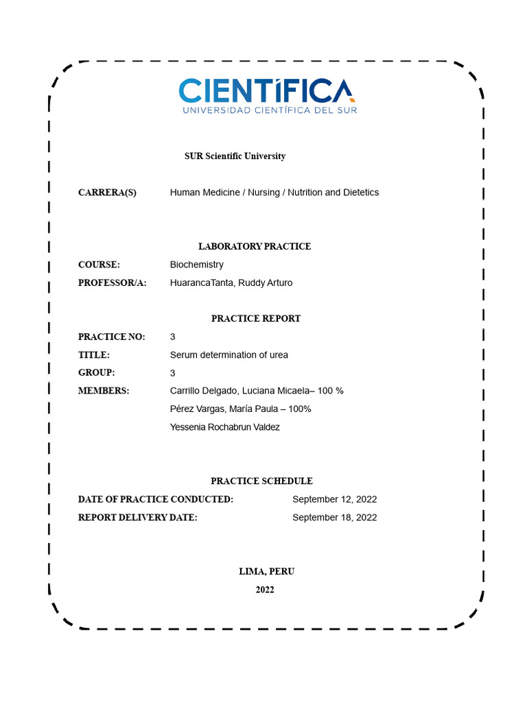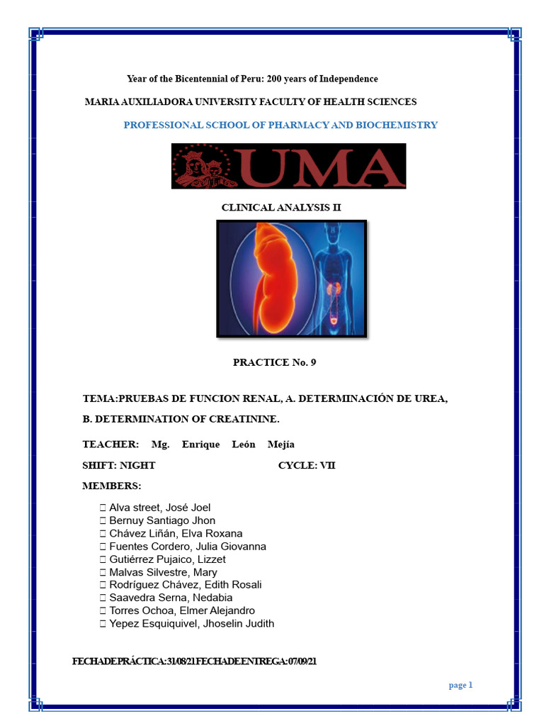 Practice N°9. Renal Function Test. Determination of Urea and Creatinine ...