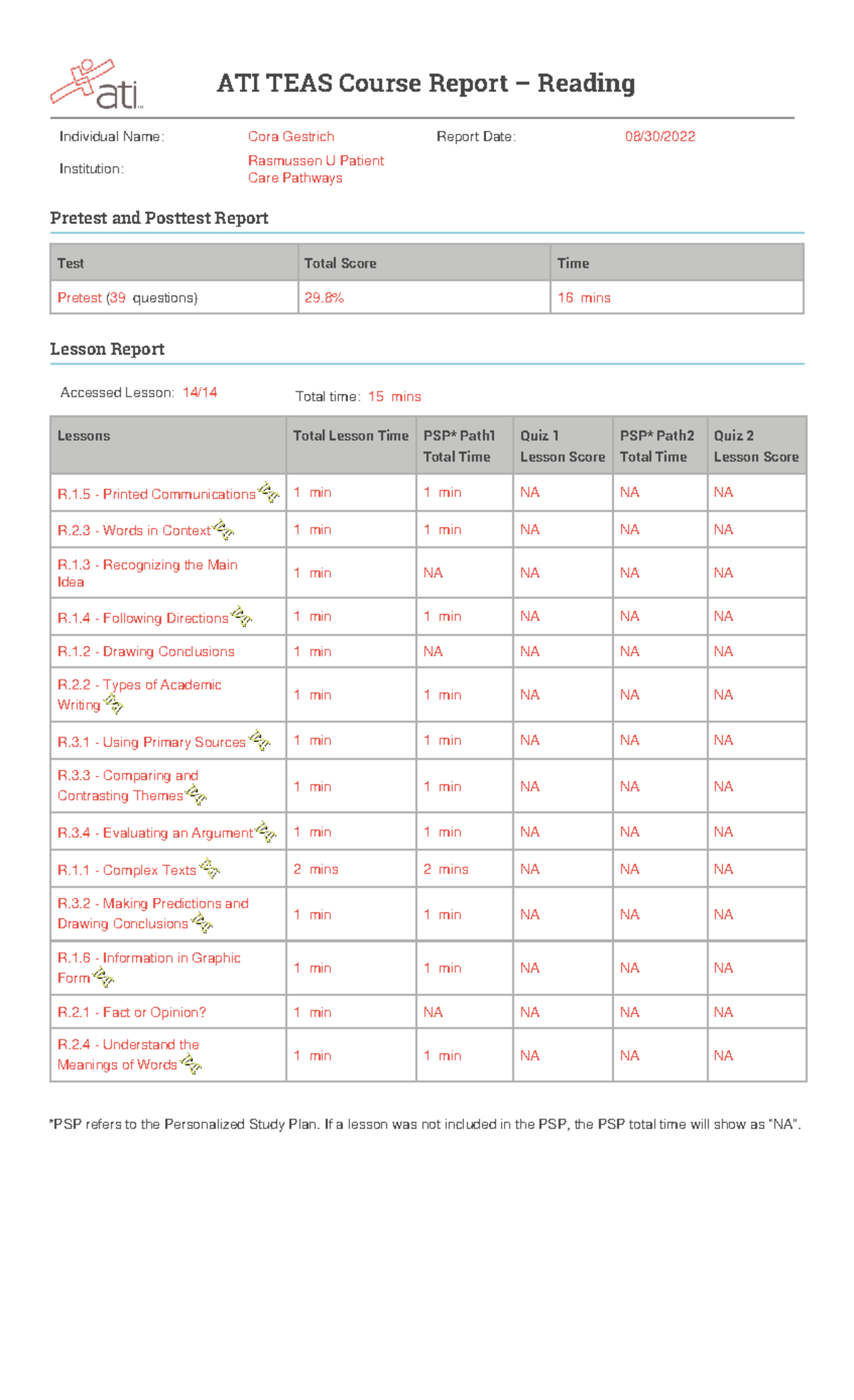 ATI TEAS Reading Course Report: Pretest & Posttest Analysis - Studocu