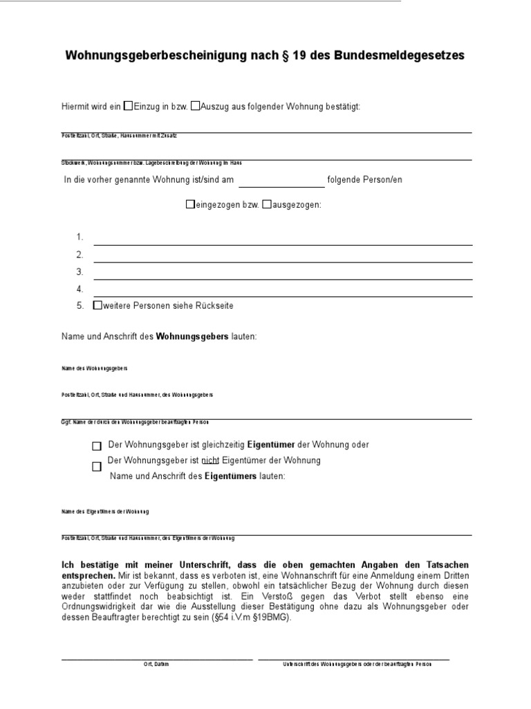 Wohnungsgeberbescheinigung Nach 19 Des Bundesmeldegesetzes | PDF