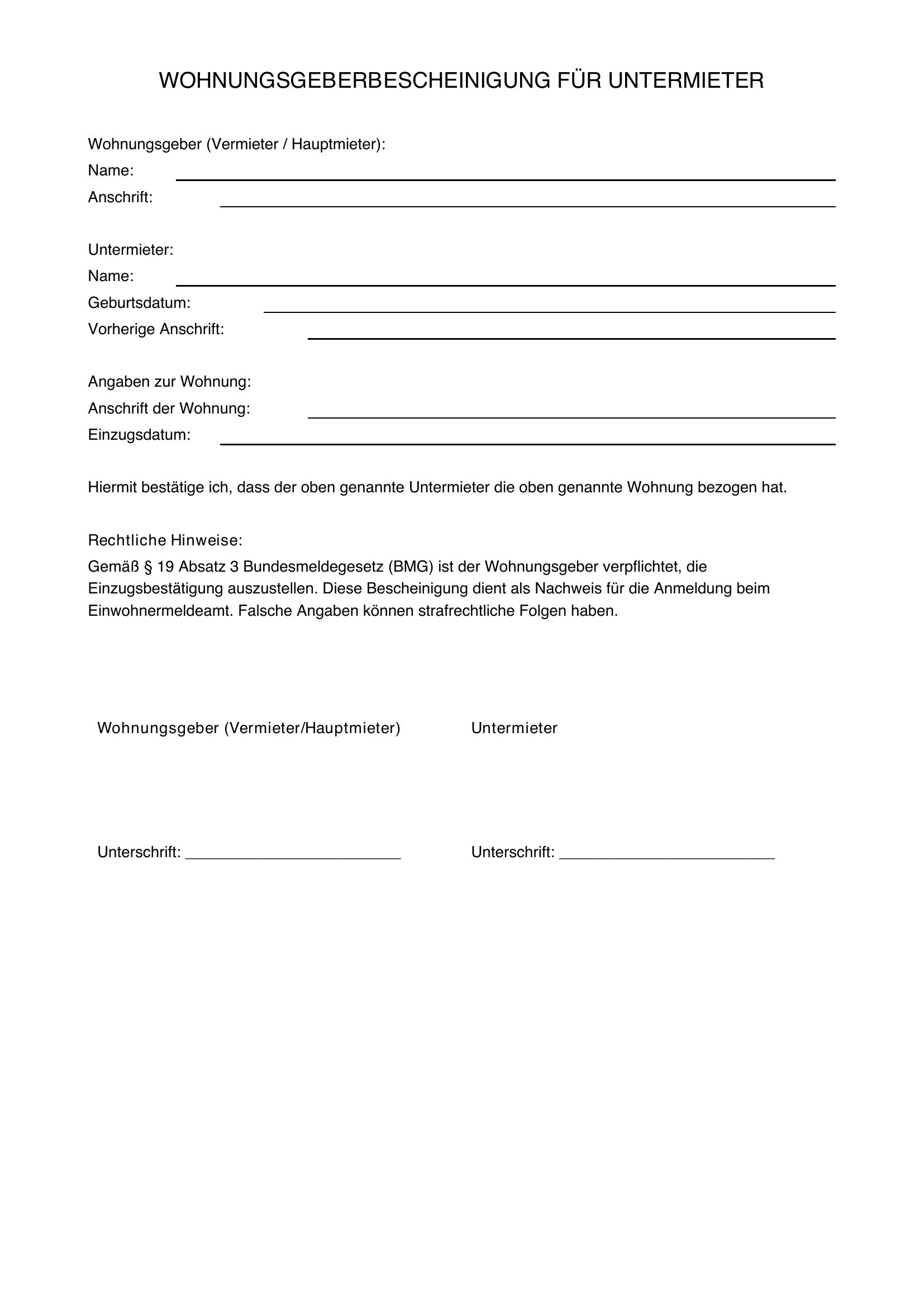 Wohnungsgeberbescheinigung Untermieter Vorlage