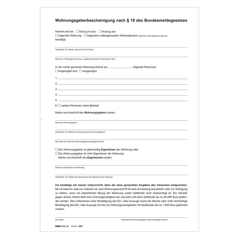 RNK Verlag Vordruck "Wohnungsgeberbescheinigung", DIN A4 1665 bei www ...