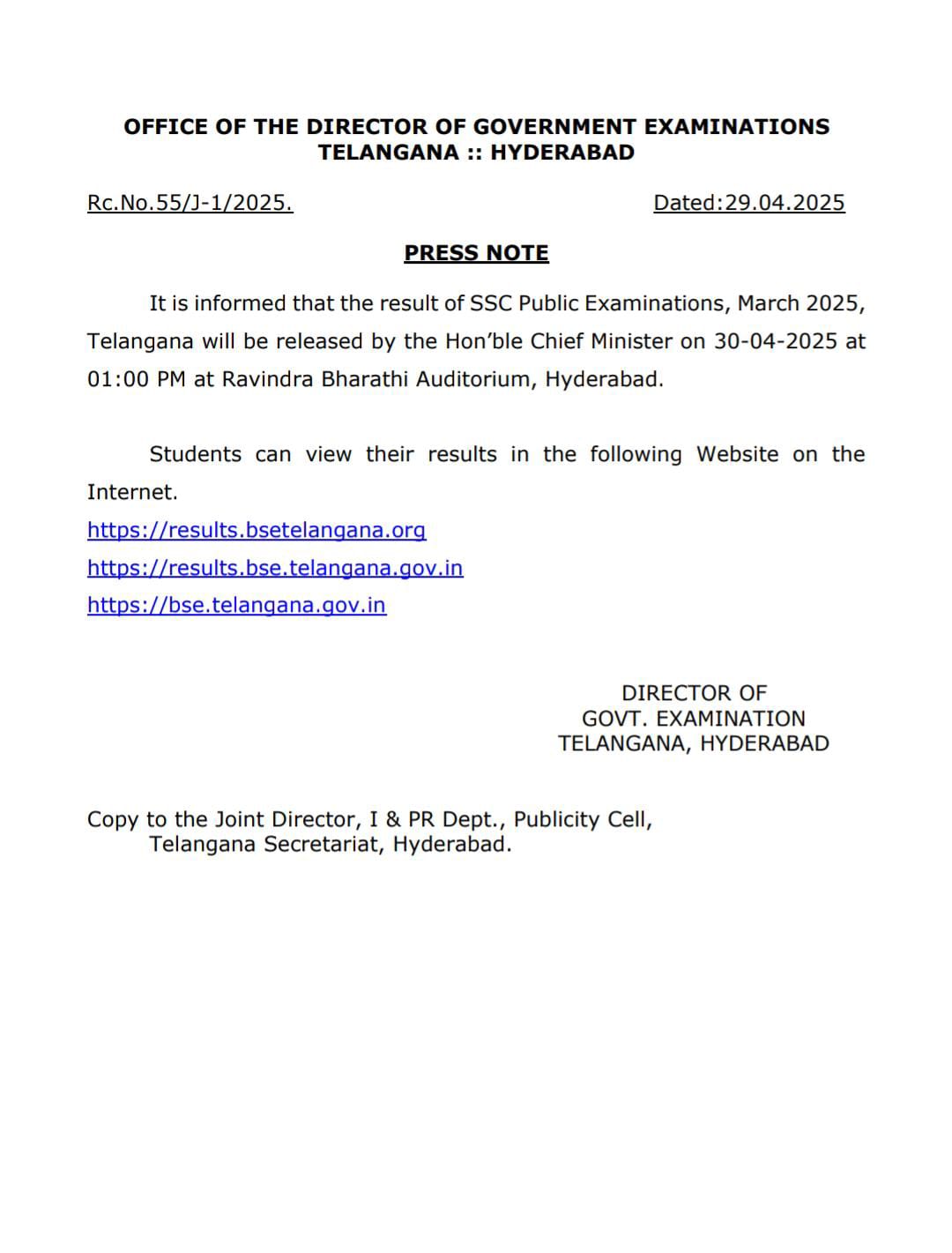 Telangana SSC Results 2025 to be OUT tomorrow at 1 PM on bse.telangana ...