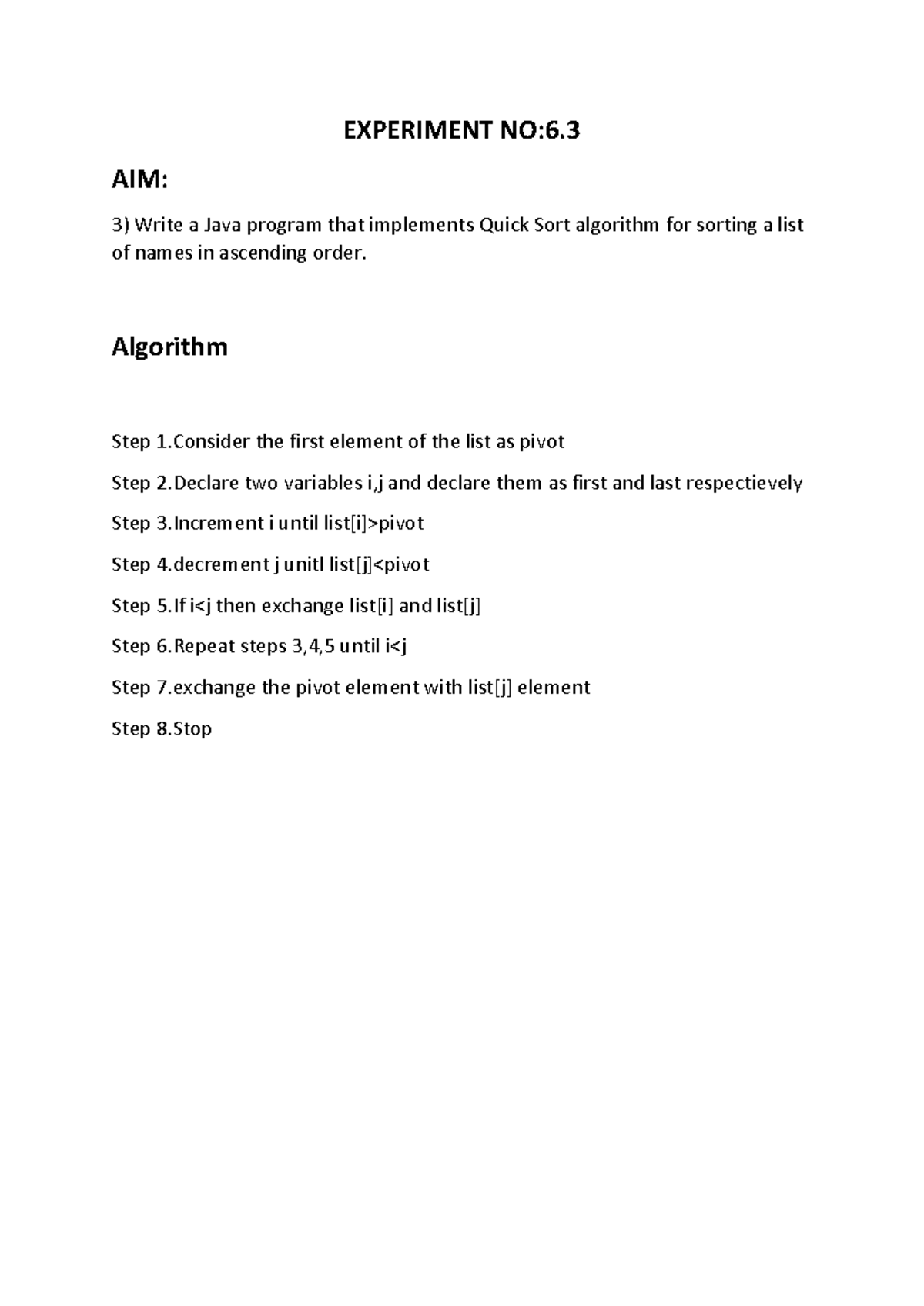 java file programs - EXPERIMENT 7 Aim: Write a program in Java to sort ...