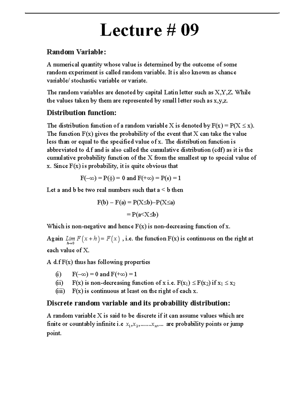 Lecture 9 - lec - ####### ####### RandomVariable: - Studocu