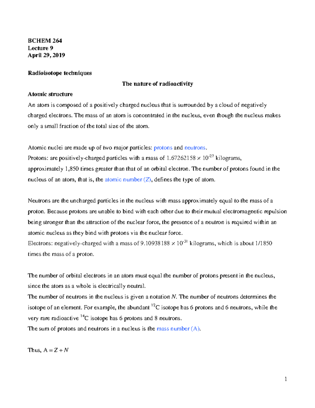 BCHEM 264 Lecture 9: Radioisotope Techniques and Atomic Structure - Studocu