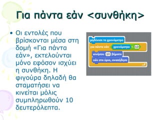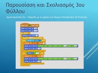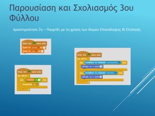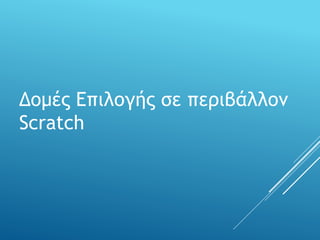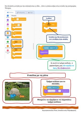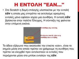 Based on this image's title: “Δομές Επιλογής Scratch. Παρουσιάζονται δραστηριότητες με σκοπό να ...”
