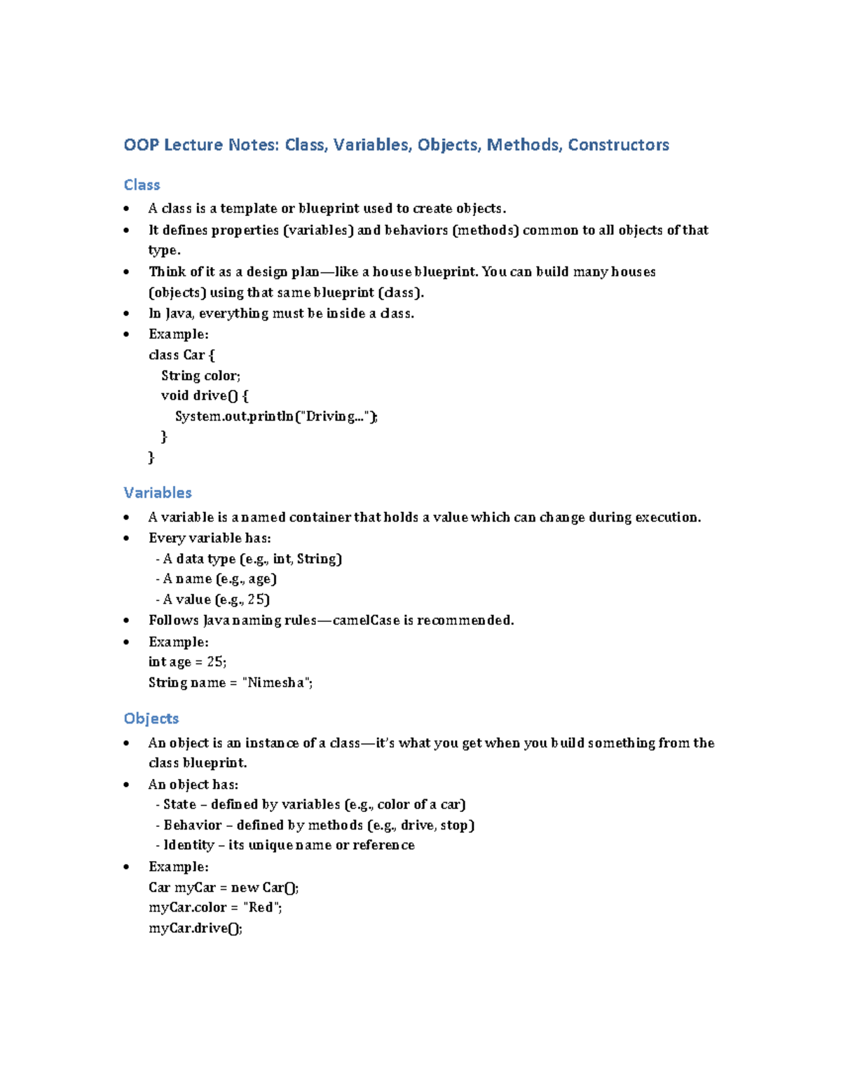 OOP Lecture Notes: Classes, Variables, Objects & Methods - Studocu