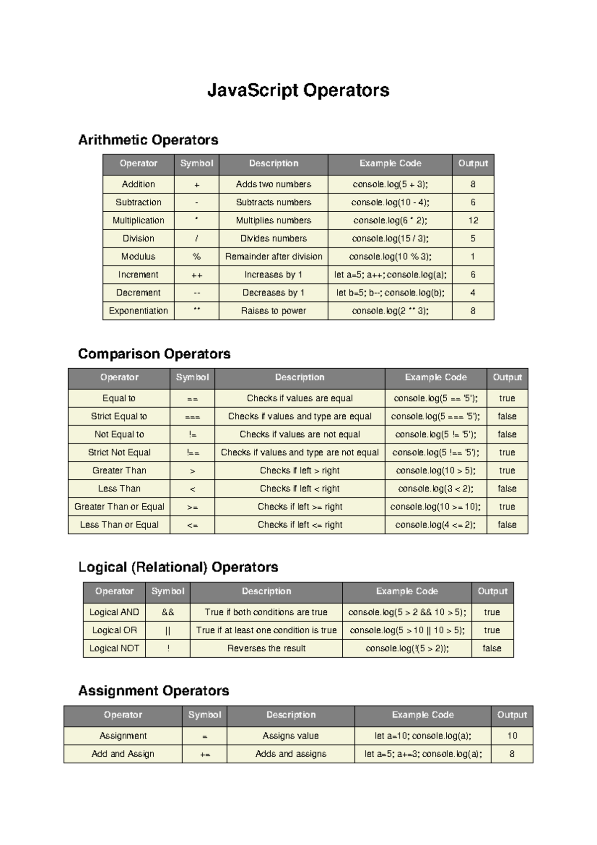 Essential JavaScript Operators: A Comprehensive Cheatsheet | Course Hero