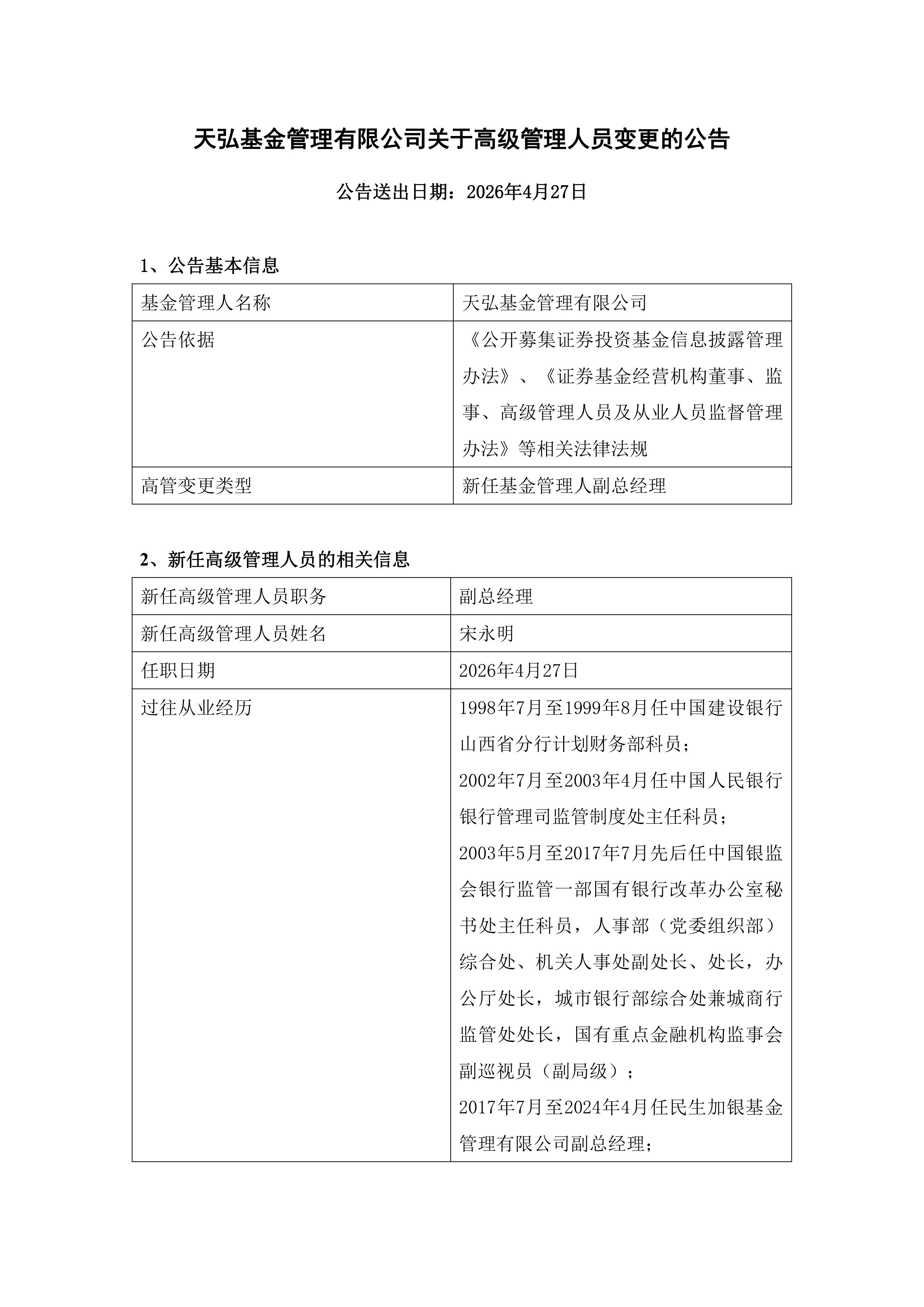 基金-港股汽车ETF天弘-天弘基金管理有限公司关于高级管理人员变更的公告