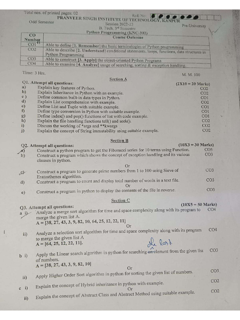 PYTHON PROGRAMMING (KNC302), BTECH 2nd year AKTU 2022-23 EXAM QUESTION ...