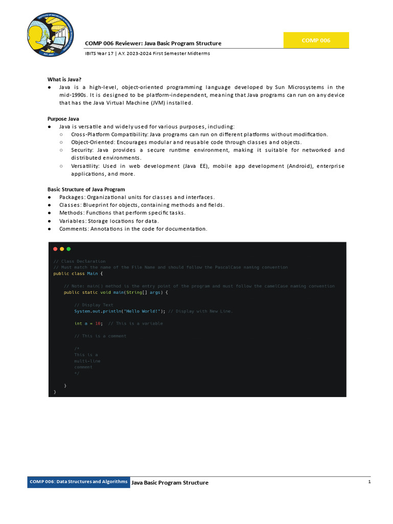 COMP 006 Reviewer - Java Basic Program Structure | PDF | Software ...