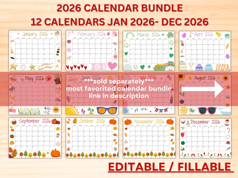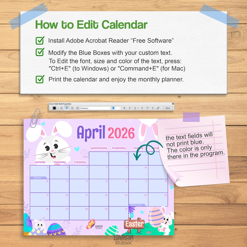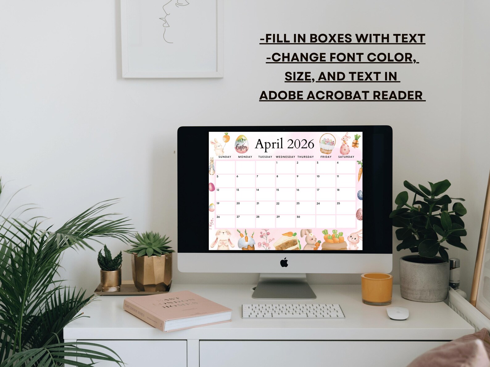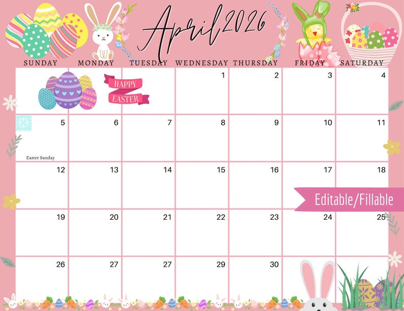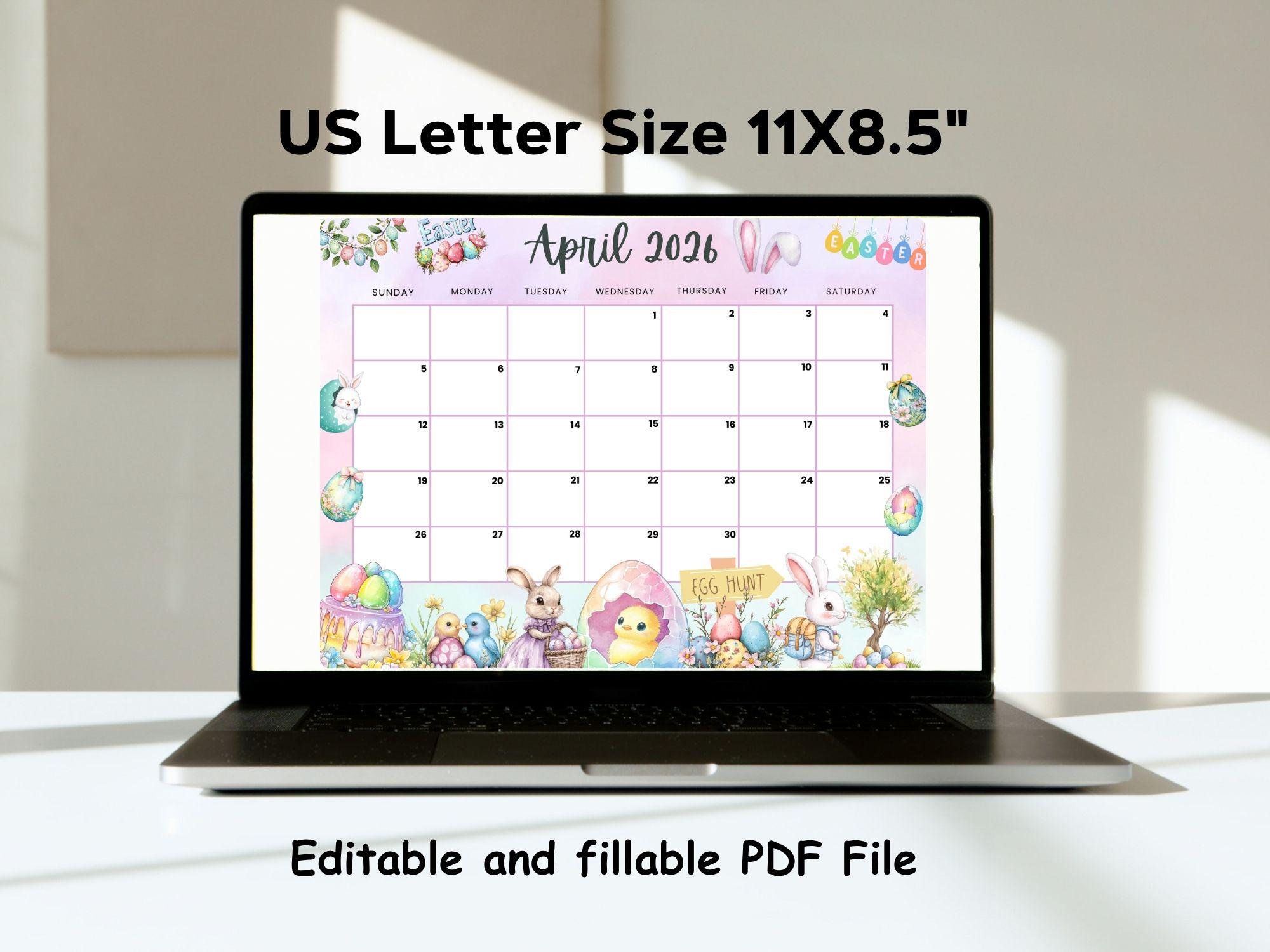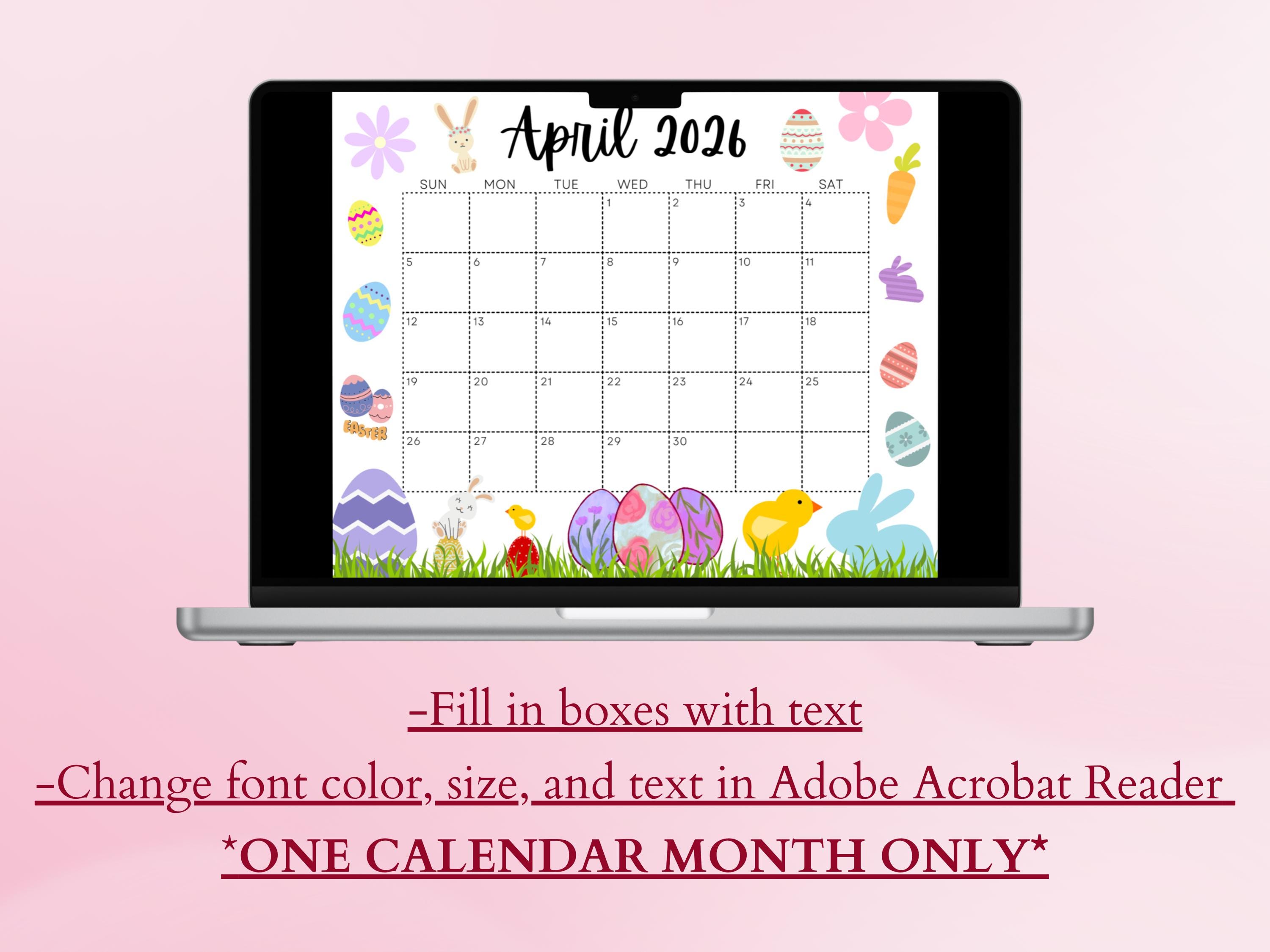 Editable Fillable April 2026 Calendar for Happy Easter With Cute Bunnie ...