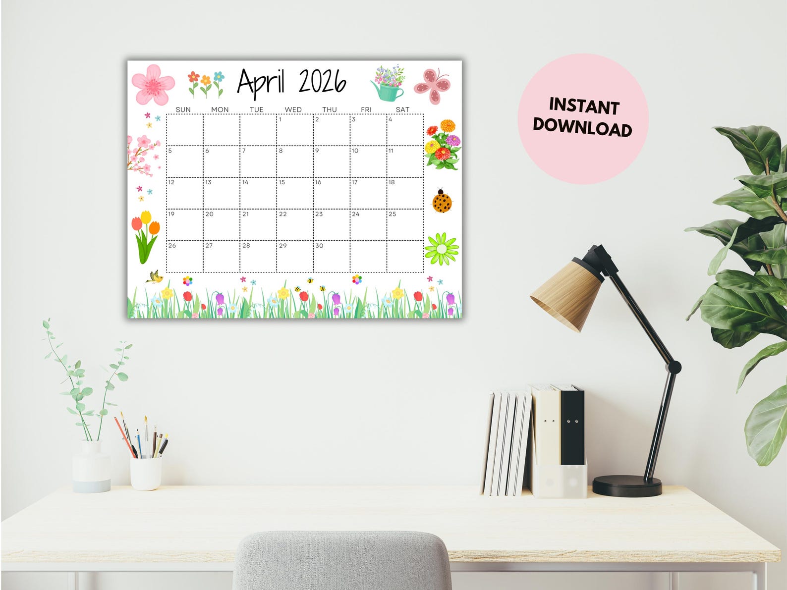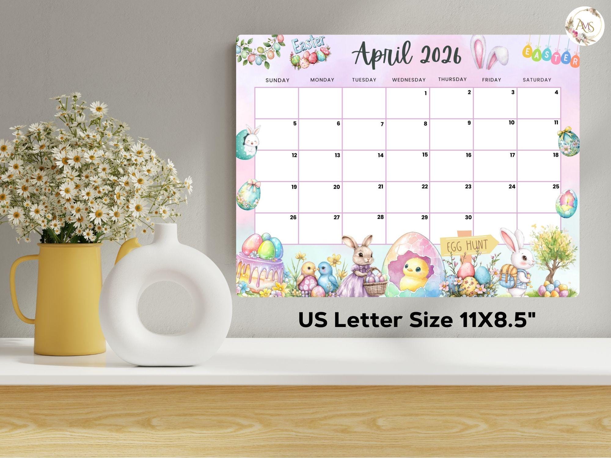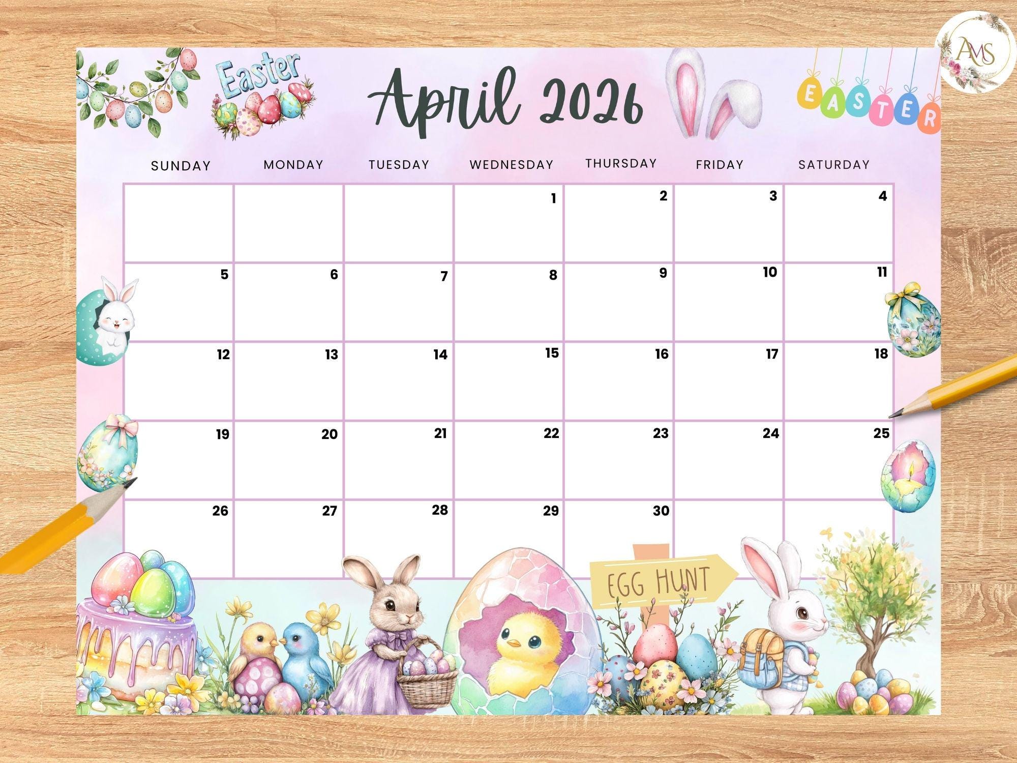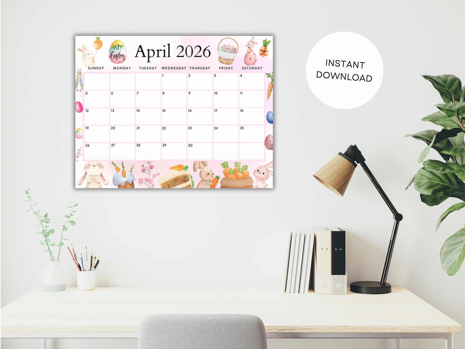 April 2026 Calendar: Light Pink Easter Printable (PDF, PNG, JPG) - Etsy