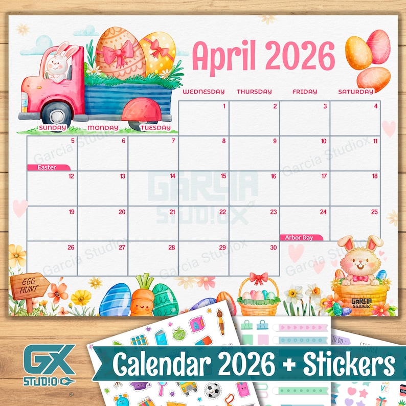 April 2026 Calendar Printable With Easter Bunny Truck, Cute Kids Easter ...