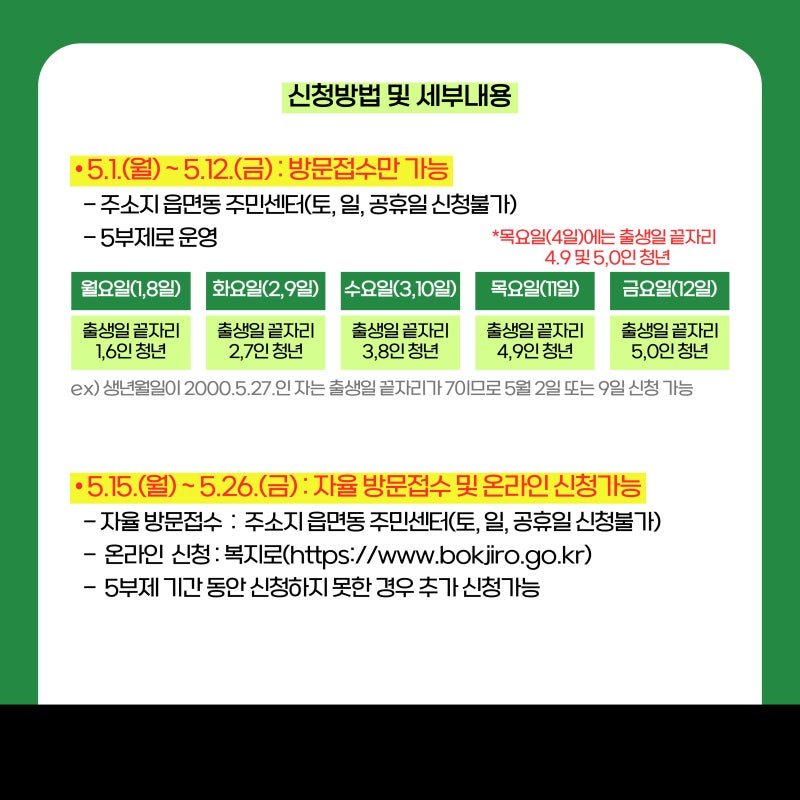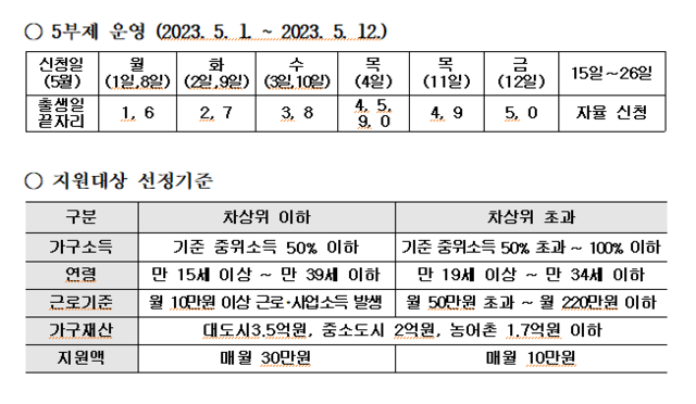 청년내일저축계좌 가입 방법, 5부제 신청 방법 및 일정, 정부 지원금
