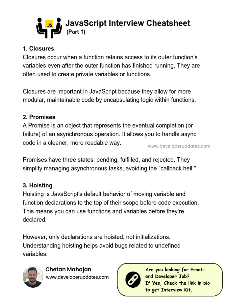 Based on this image's title: “JavaScript Interview Cheatsheet | PDF”