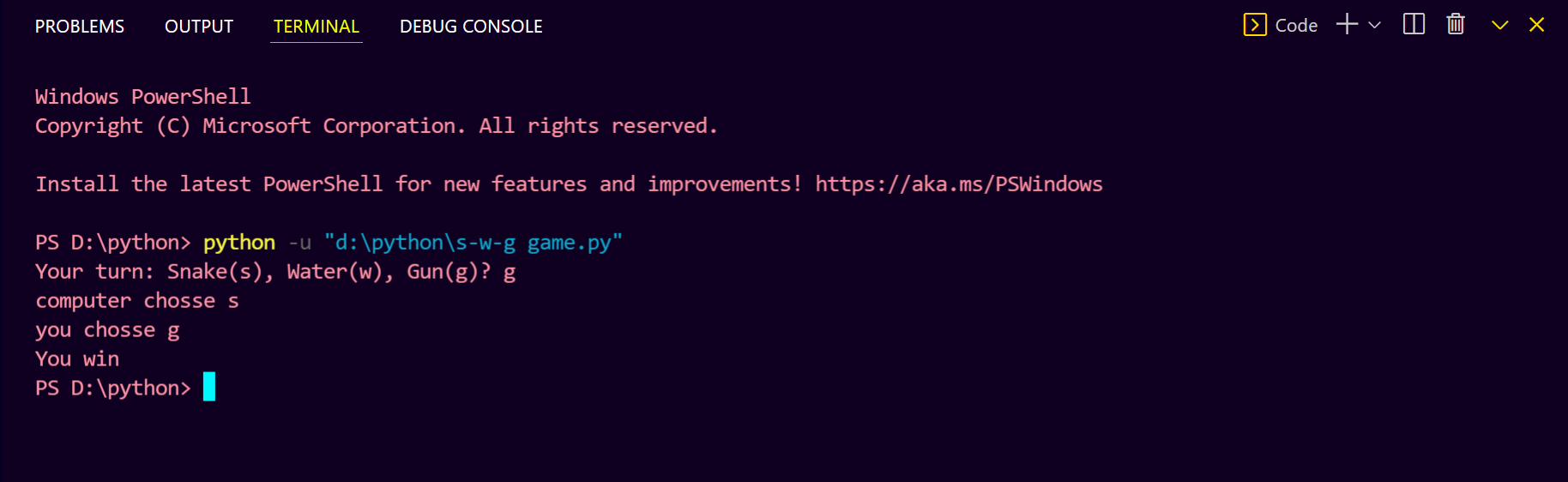 Efficient Snake Water Gun Game Code in Python ππ§π« #PythonShorts #VSCode ...