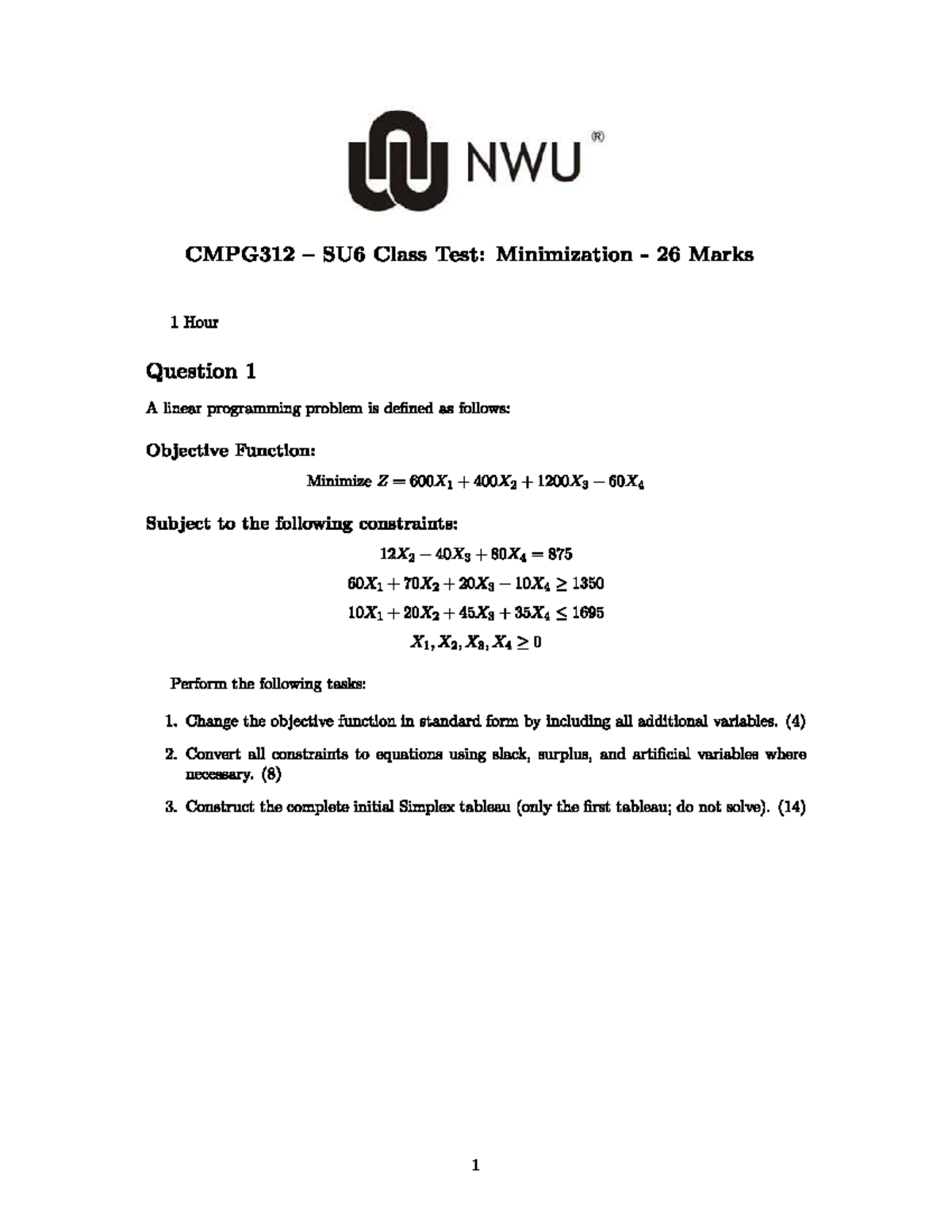 SU6 CMPG312 Class Test: Linear Programming Minimization Practice - Studocu