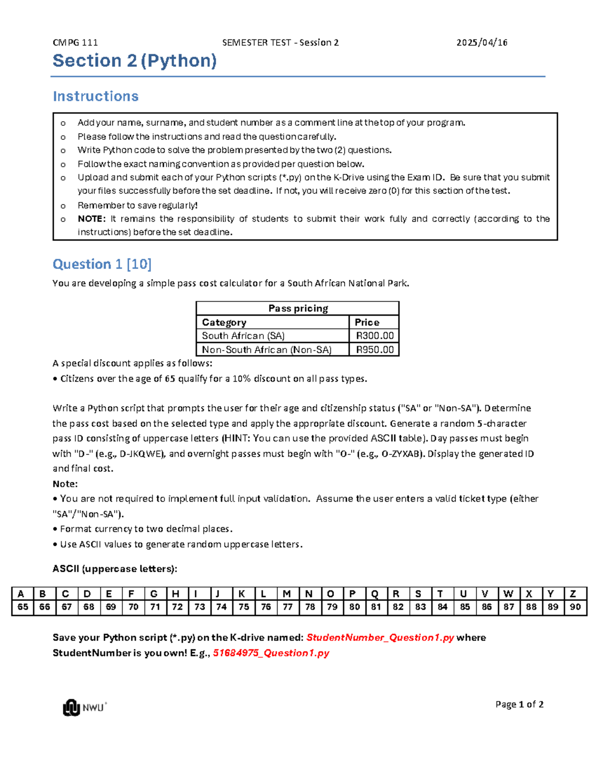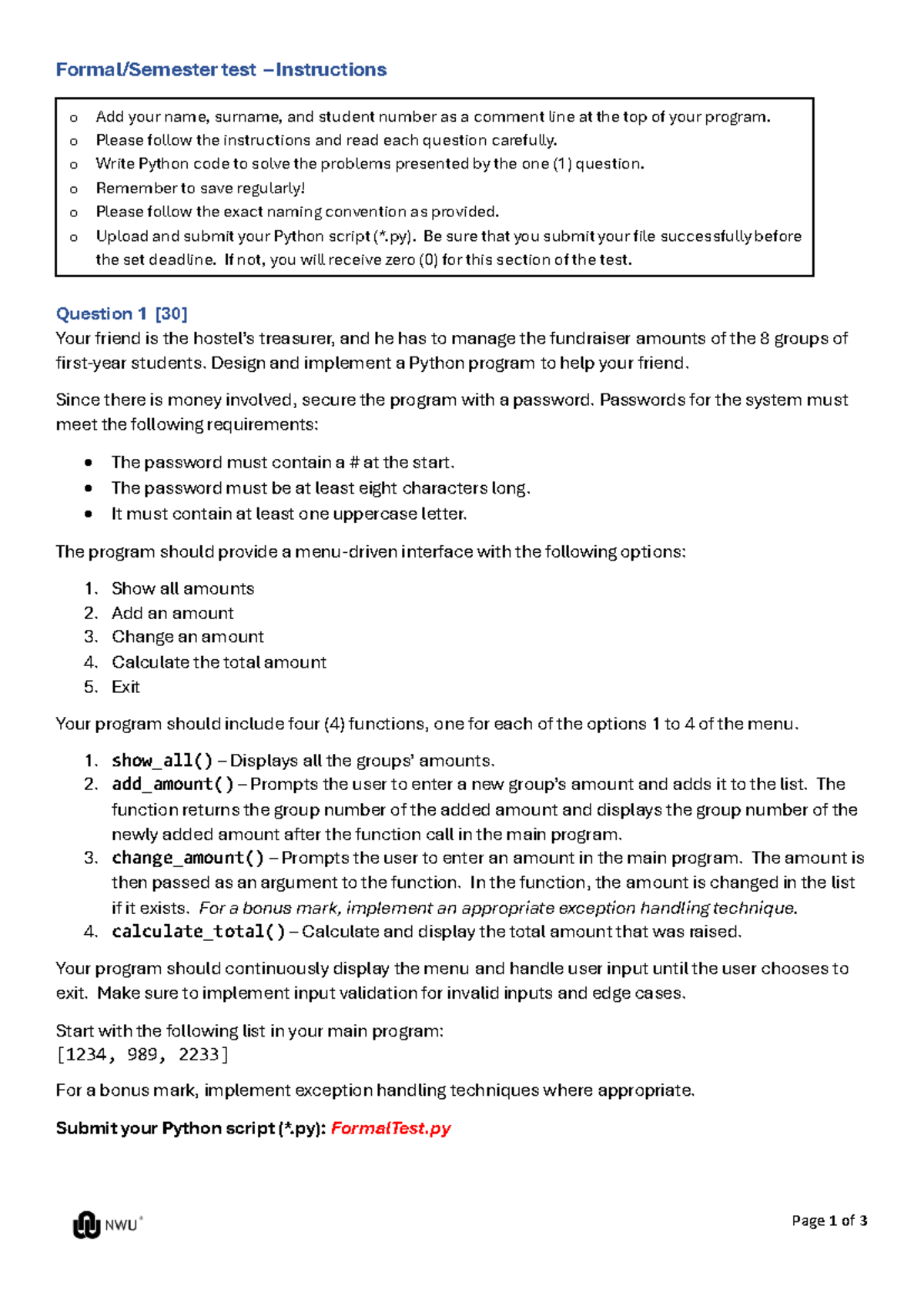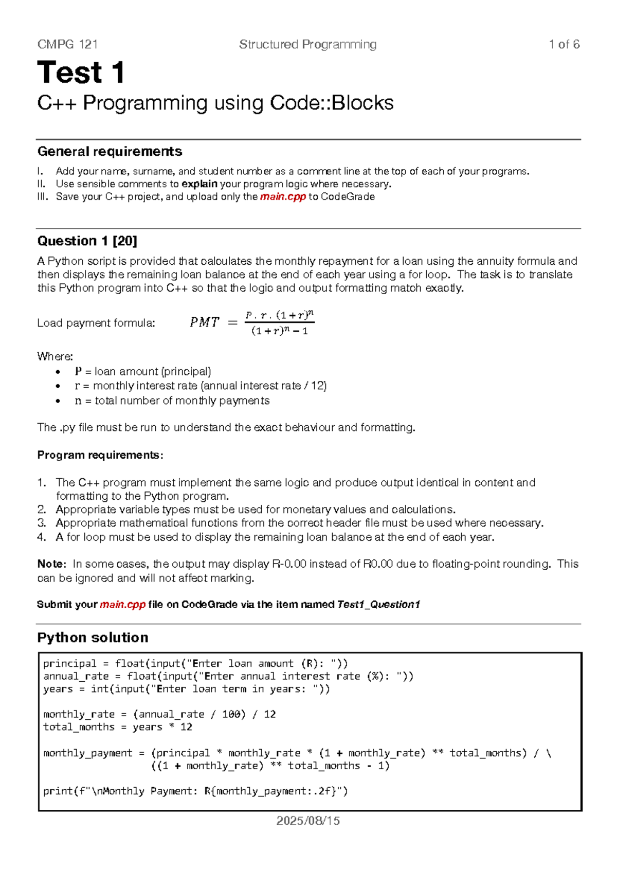CMPG111 Formal Test Instructions and Python Program Guide 2024 - Studocu