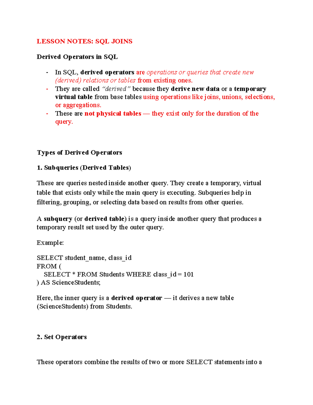 LESSON NOTES: SQL JOINS and Derived Operators in DB - Studocu