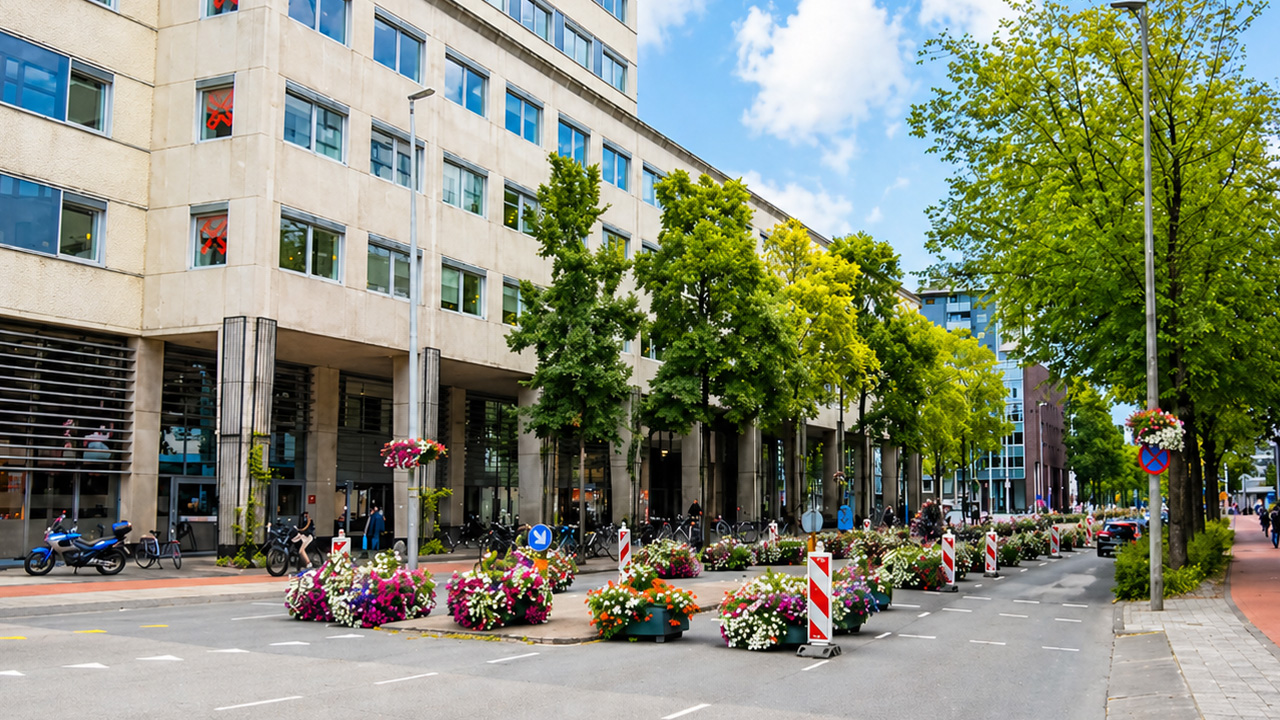 A colorful street scene in modern Amsterdam city