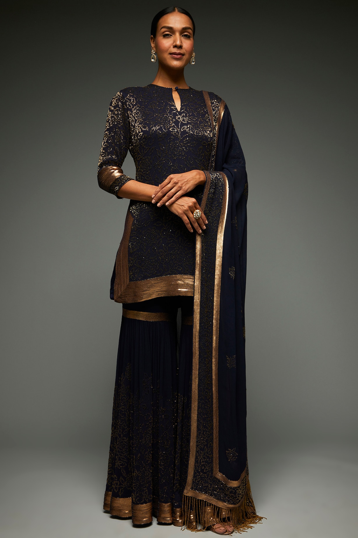 Navy Blue Silk Chiffon Embroidered Sharara Set by Nakul Sen at Pernia's ...