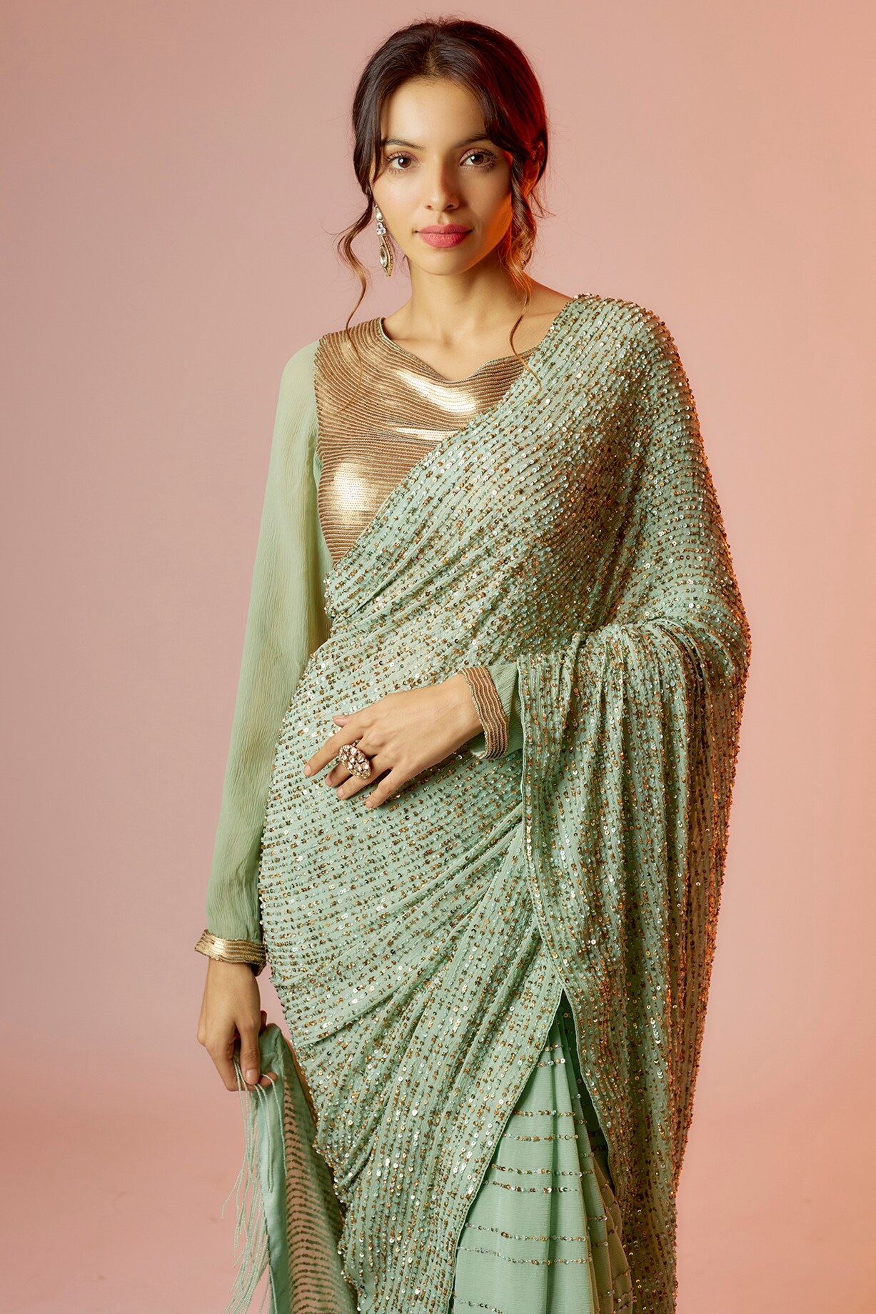 Mint Green Chiffon Embroidered Saree Set Design by Nakul Sen at Pernia ...