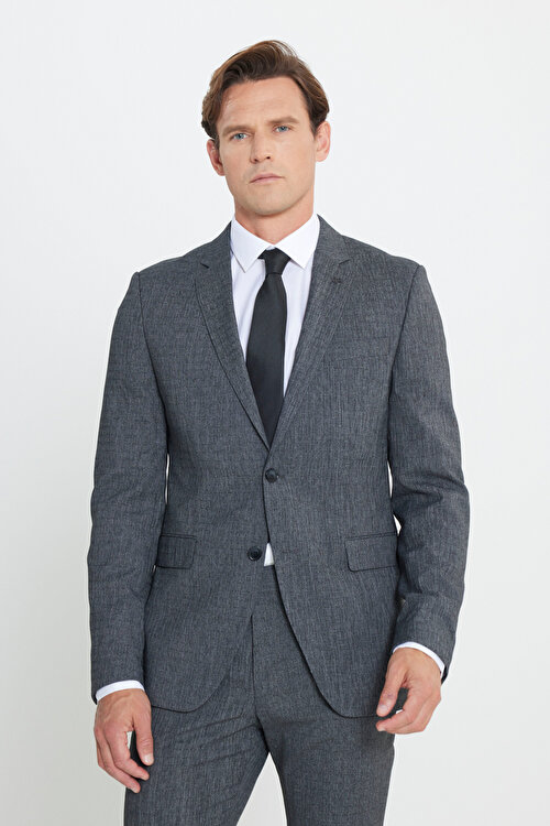 Slim Fit Dar Kesim Mono Yaka Desenli Siyah-Antrasit Takım Elbise ...
