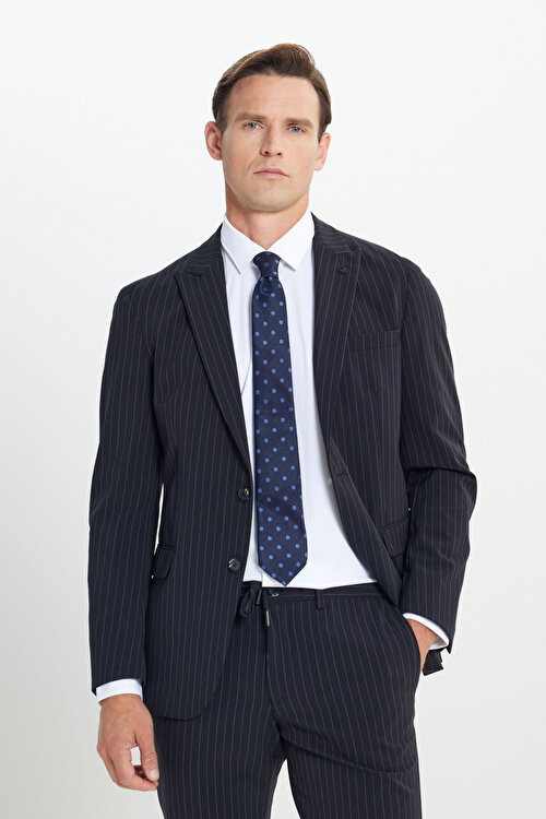 Slim Fit Dar Kesim Kırlangıç Yaka Çizgili Koyu Lacivert Takım Elbise ...