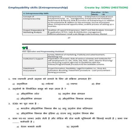 Employability Skills Entrepreneurship ITI MCQ | PDF