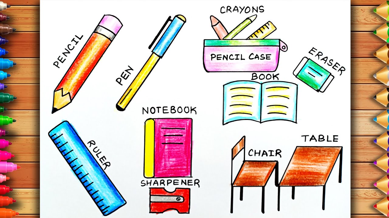 Classroom Objects Drawing | School Supplies Drawing | School things ...