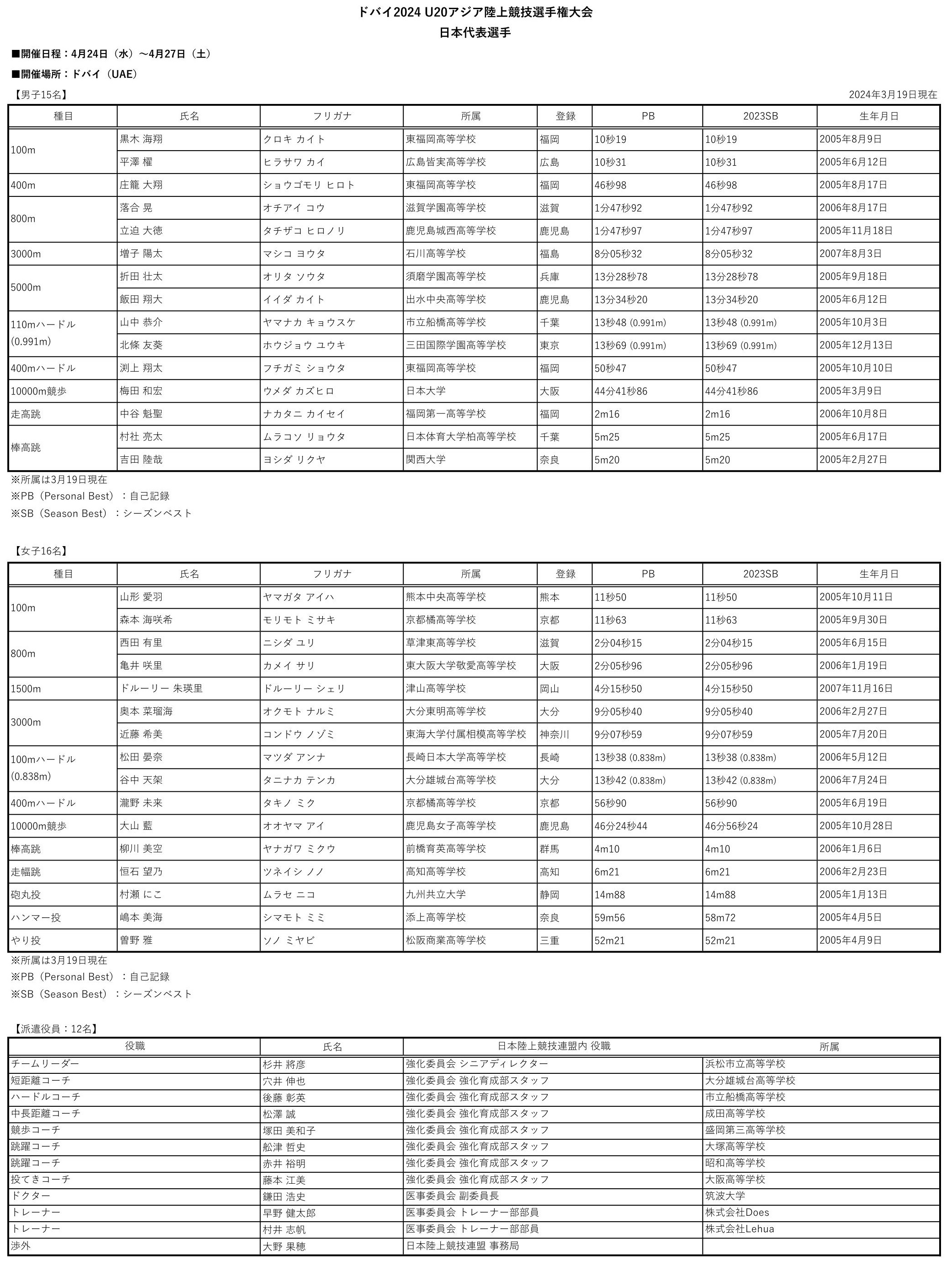 【ドバイ2024 U20アジア選手権】日本代表選手31名が決定~黒木海翔、立迫大徳、瀧野未来が連覇を狙う~:日本陸上競技連盟公式サイト