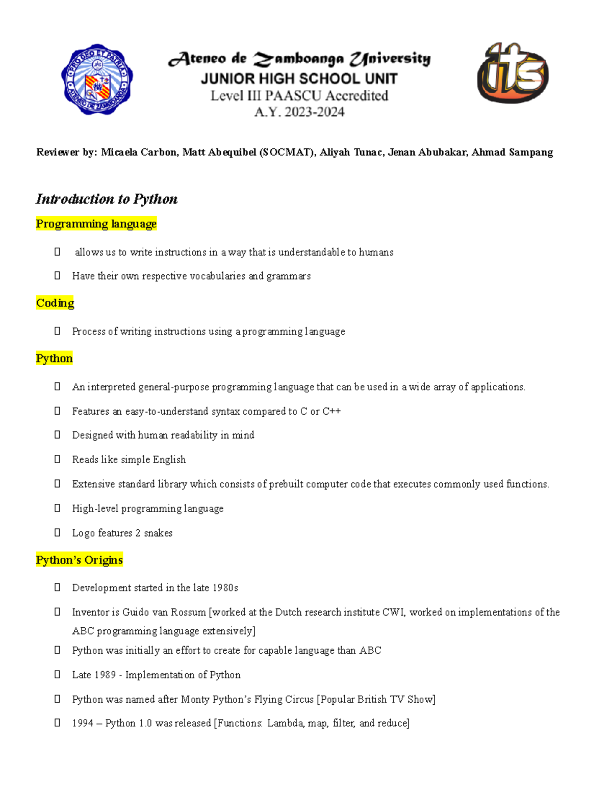 Q1 ITS Lesson Python 1 - Reviewer by: Micaela Carbon, Matt Abequibel ...