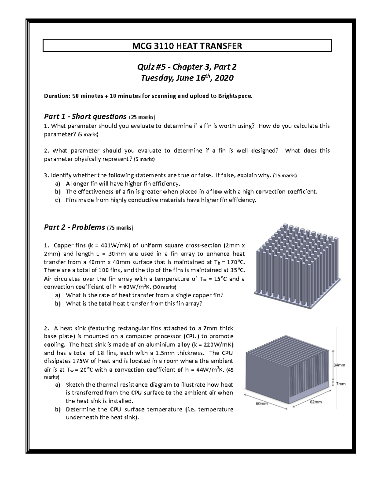 2020 Quiz 5 - QUIZ - MCG 3110 HEAT TRANSFER Quiz #5 - Chapter 3, Part 2 ...