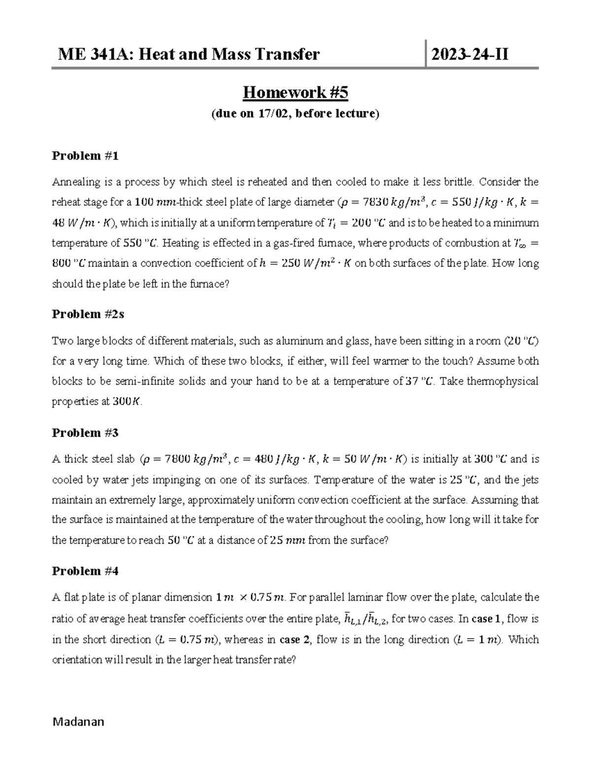 Homework 5 - practice problem solving - ME 341A: Heat and Mass Transfer ...