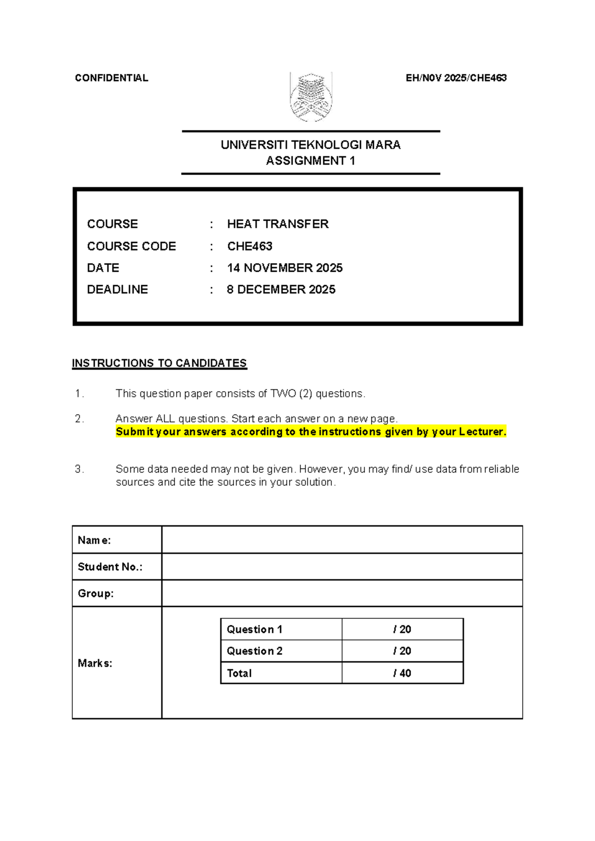 Assignment 1: Heat Transfer Analysis - CHE463 - Studocu