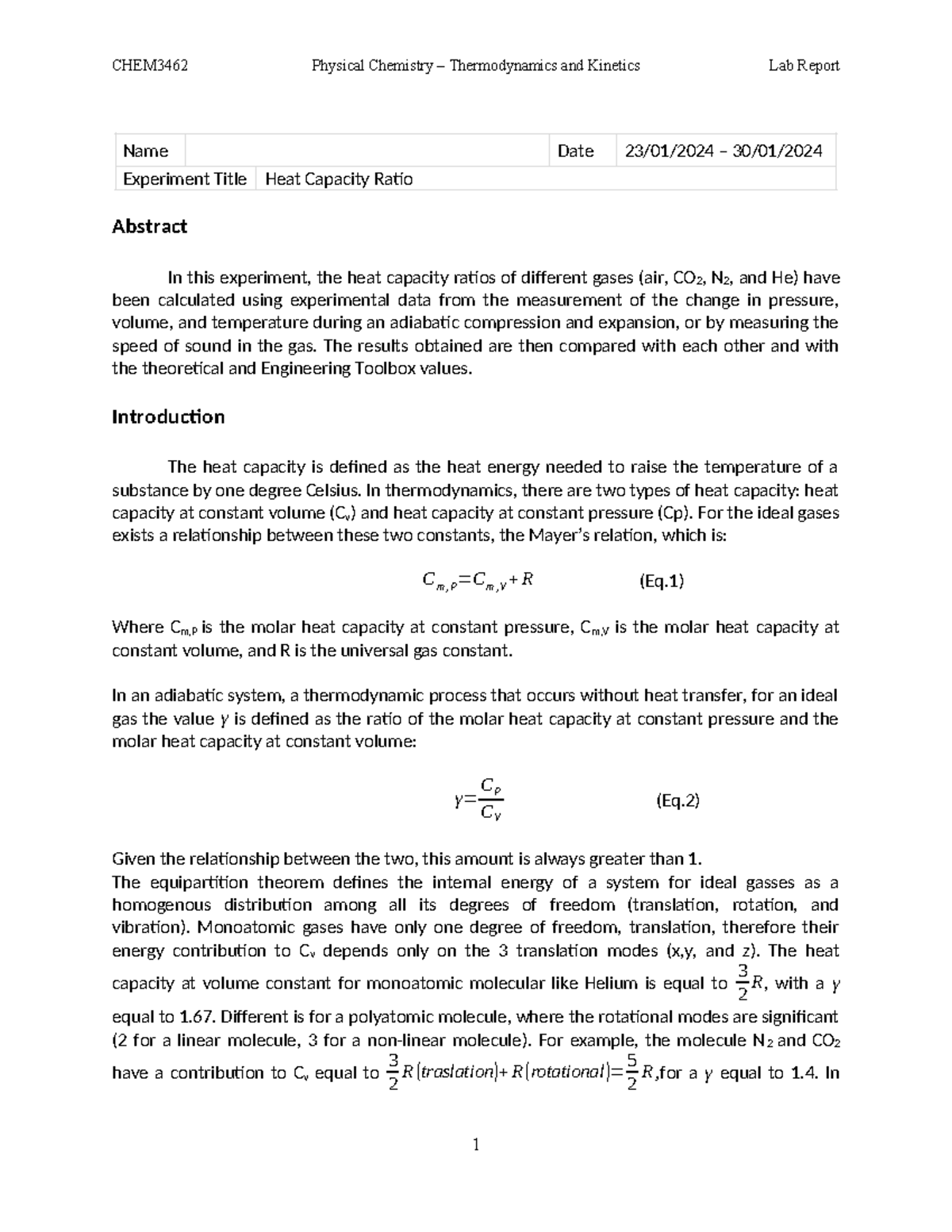 Heat Capacity Lab Report (PHYS 101): Analysis of Gas Ratios - Studocu