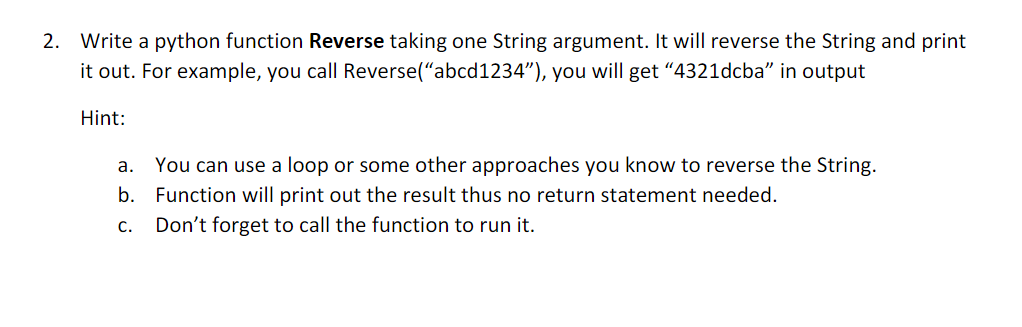 Solved 2. Write a python function Reverse taking one String | Chegg.com