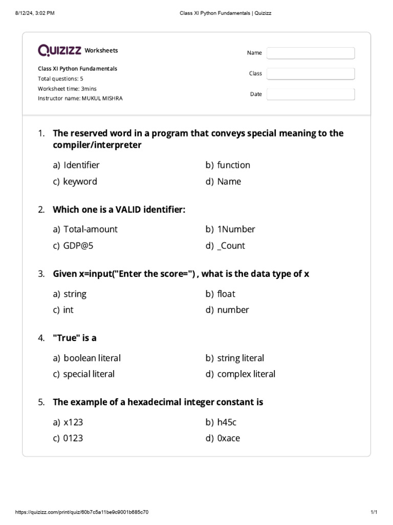 Class 11 Python Fundamentals Worksheet | PDF | Computers