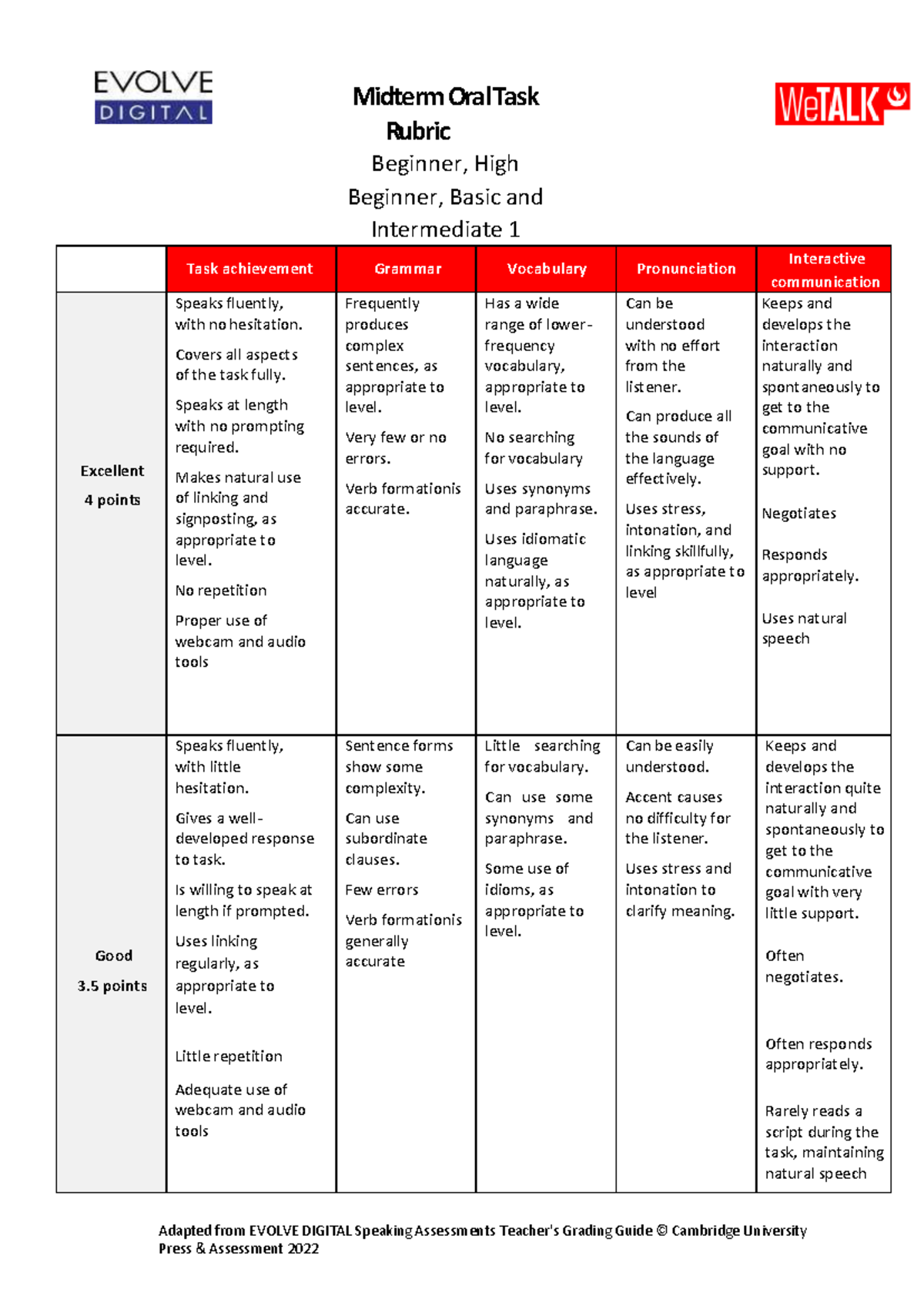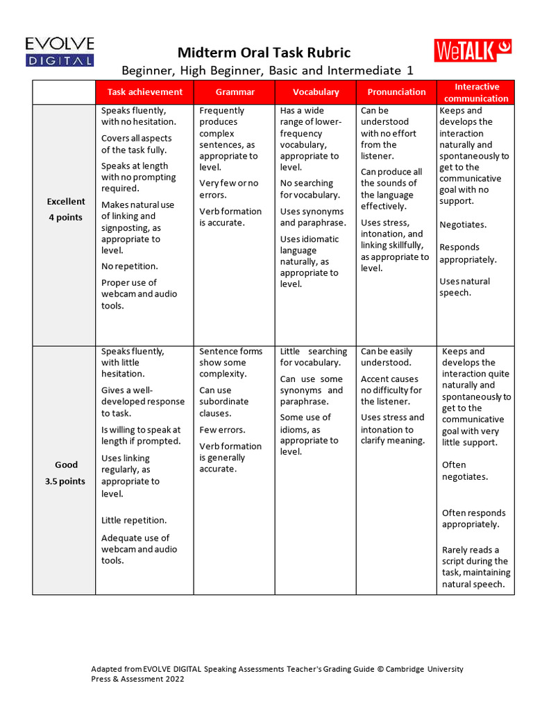 MT ORAL TASK Rubric HB - Adapted from EVOLVE DIGITAL Speaking ...