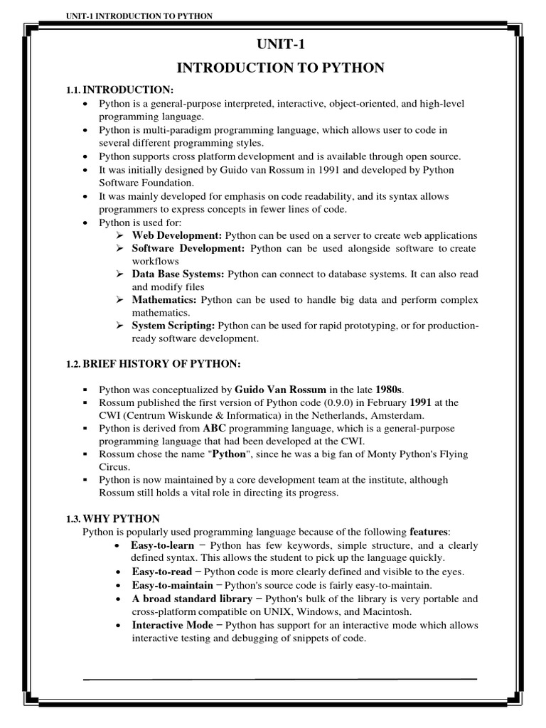 Python Programming Unit 1 Introduction to Python History of Python Why ...