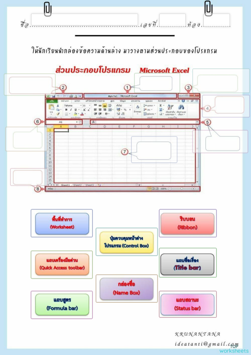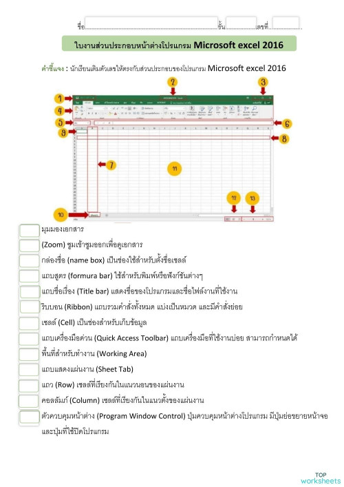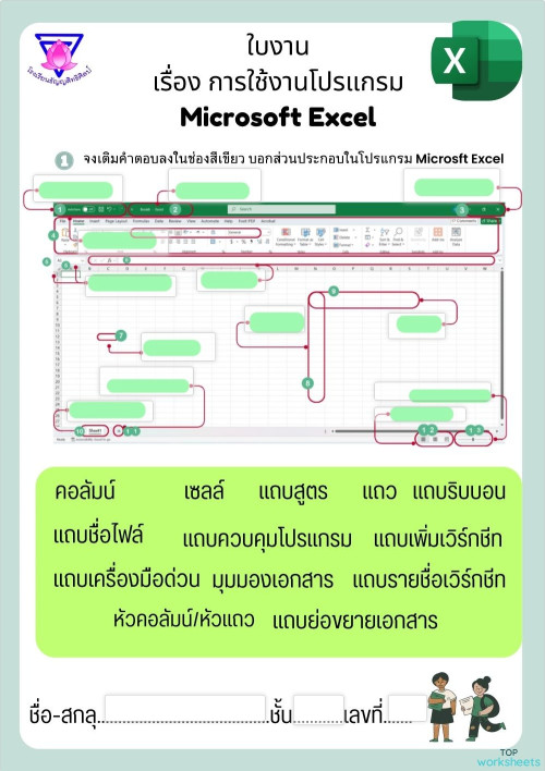 ใบงาน ส่วนประกอบของโปรแกรม Excel ใบงานเชิงโต้ตอบ | TopWorksheets