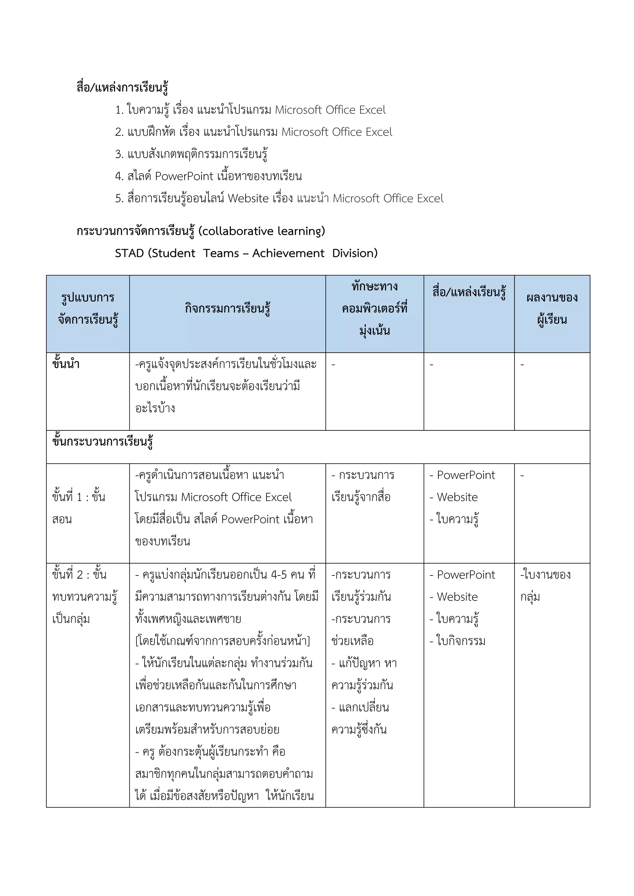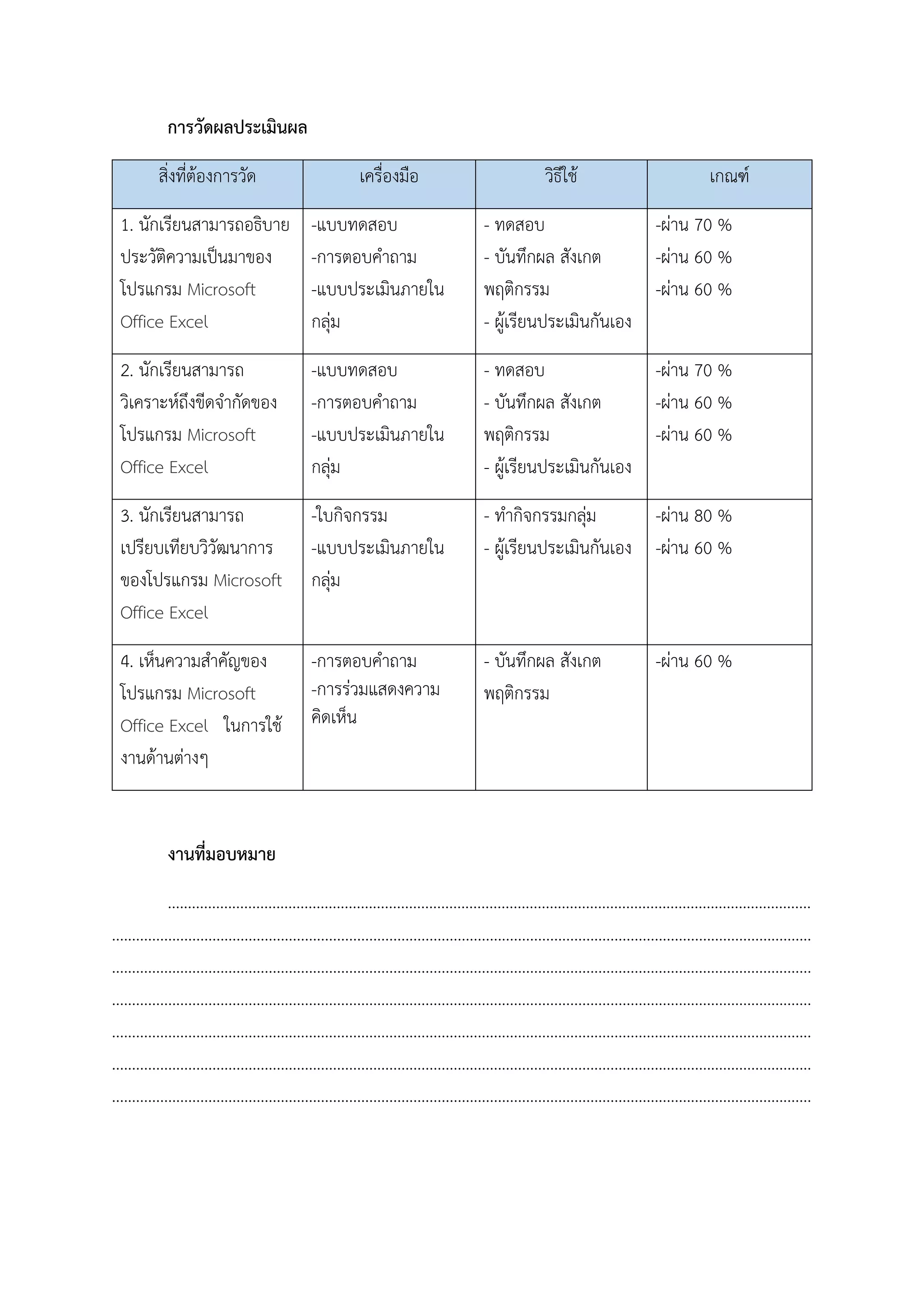 แผนการเรียนรู้การใช้งานโปรแกรม Microsoft Office Excel | PDF