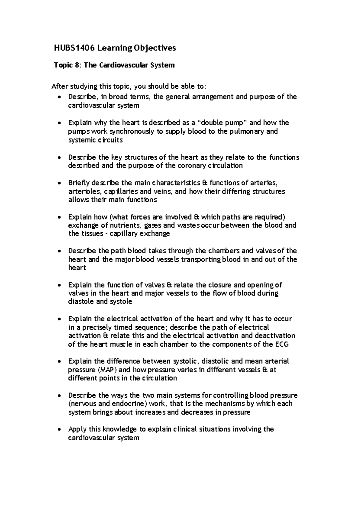 HUBS1406 Learning Objectives: Cardiovascular System Overview - Studocu