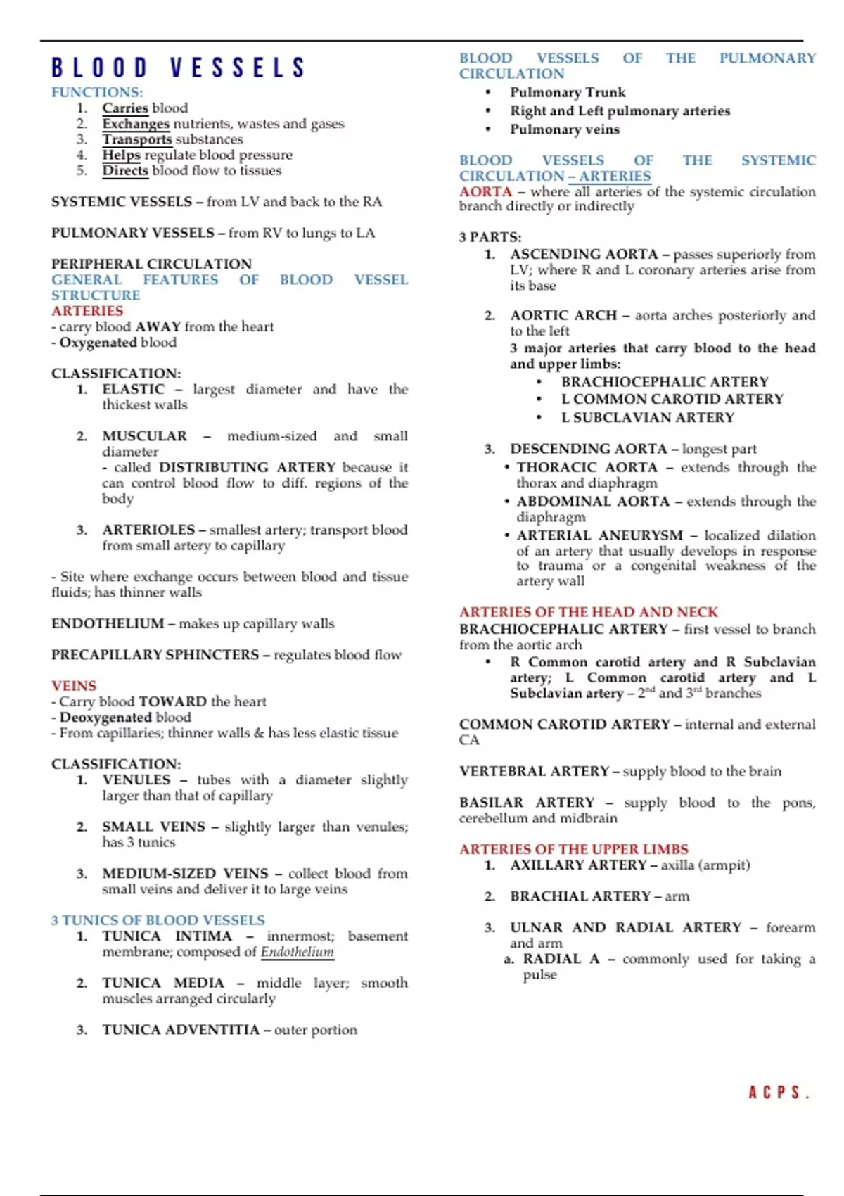Class Notes (Summary) of Blood Vessels I Anatomy and Physiology ...