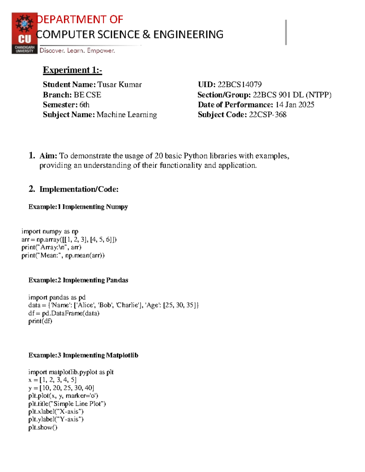 Experiment 1: Python Libraries in Machine Learning (BE CSE 6th Sem ...